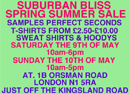 Toby Shualls amazing Suburban Bliss label are having a Spring/Summer sale in London this coming weekend, with a whole load of samples, sales, seconds, shirts,...