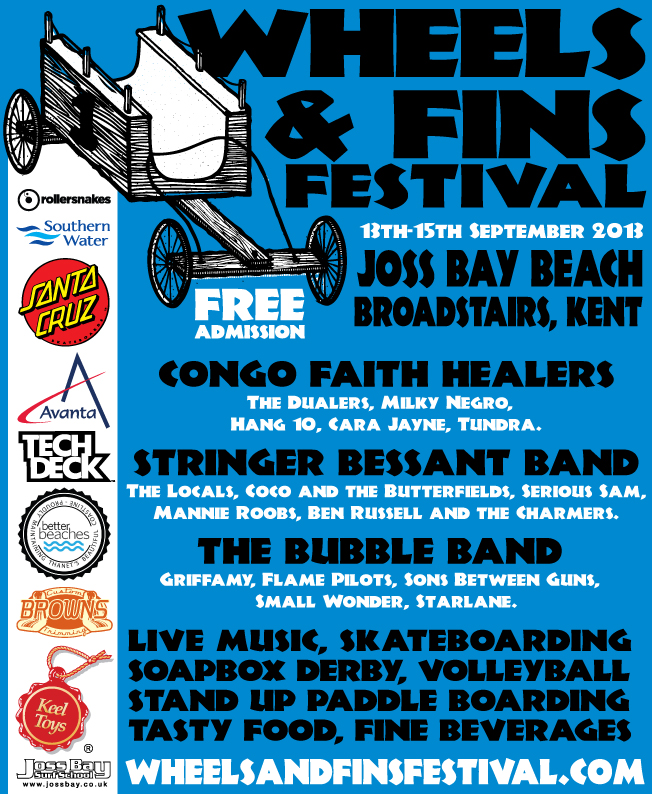 Founded in 2012, the first Wheels and Fins festival at Joss Bay Beach in Broadstairs, Kent was a resounding success, with great attendance and huge support from the local community. The event is built around live music and DJs, and also features stand up paddle board demos and a fun race, a beach volleyball tournament, an epic soapbox derby, plus a skateboard mini ramp competition and demos, and slalom and downhill races.