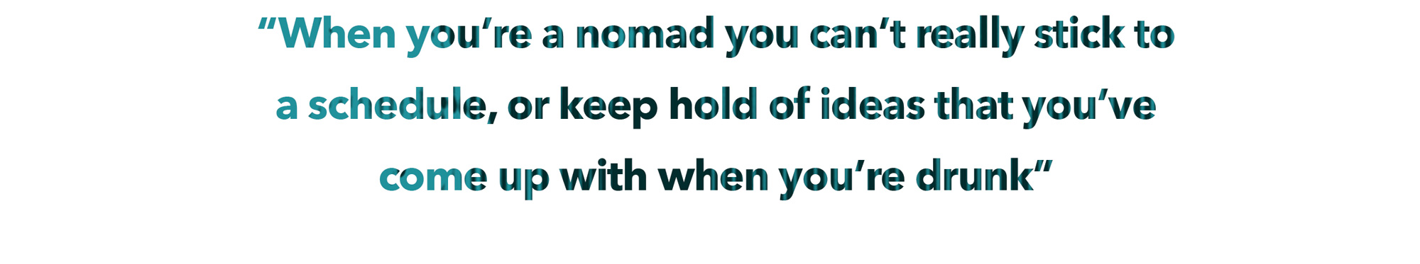I can’t remember [laughs]. I’m pretty flaky on that shit – I’ll have ideas when I’m drunk, get one thing done and then my brain moves on to the next project pretty much straight away. I’m not too, umm, consistent in life…or in general. But when you’re a nomad you can’t really stick to a schedule, or keep hold of ideas that you’ve come up with when you’re drunk.