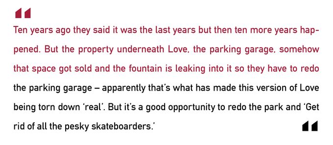 Well supposedly, the fences were supposed to go back up on the 12th but that hasn’t happened. I’m getting Snapchats from my friends, to this day, skating there and Thrasher posted some of them. My homie, he did like a one foot switch back tail or something, you go on there and you’ll see it. People are still skating there so I don’t know. Ten years ago they said it was the last years but then ten more years happened. But the property underneath Love, the parking garage, somehow that space got sold and the fountain is leaking into it so they have to redo the parking garage – apparently that’s what has made this version of Love being torn down ‘real’. But it’s a good opportunity to redo the park and “Get rid of all the pesky skateboarders.”