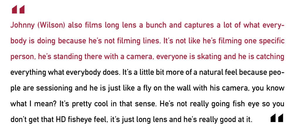 Yeah, but Johnny also films long lens a bunch and captures a lot of what everybody is doing because he’s not filming lines. It’s not like he’s filming one specific person, he’s standing there with a camera, everyone is skating and he is catching everything what everybody does. It’s a little bit more of a natural feel because people are sessioning and he is just like a fly on the wall with his camera, you know what I mean? It’s pretty cool in that sense. He’s not really going fish eye so you don’t get that HD fisheye feel, it’s just long lens and he’s really good at it. He films pretty tight.