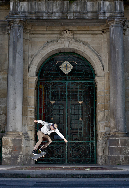 This photo took place on one of the first days, by which point we had a following of local skaters who were so hyped on having other skaters in their small town. They told us rumours (or myth) that someone had once upon a time ollied over this huge grid. Drinking our ‘Super Bocks’, we all soaked up the idea of ollieing it and I for one (probably influenced by the lethargy induced by beer and sun) was trying to get my head around why or how anybody would find the energy and effort necessary to clear this thing! Meanwhile, The Horse (Kendrick) was starting his trademark gallop towards the gap and myself. After almost trampling me, Kendrick fully committed to a backside flip. Why waste time and energy with an ollie? Whilst the rest of us drank and got excited, Kendrick repeatedly coated this religious floor with Horse sweat. If you haven’t already seen ‘Pusherman’, do it! Jesper’s expert filming allowed this trick to be an after black ender. This is definitely the cleanest/fastest/longest flip trick I’ve ever witnessed.