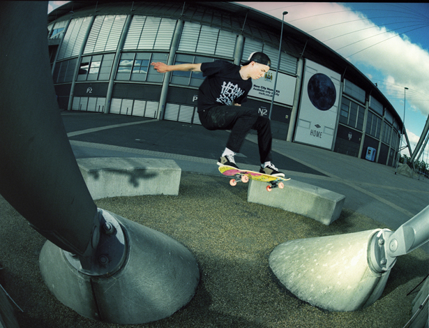Bored of sitting around the house one day, Tom Day and myself decided to explore the lesser-searched areas of Manchester’s eastern outskirts. After finding little to nothing and then being heckled out of a tiny ghetto skatepark by an eight year old – “Why are you skateboarding here? This isn’t Urbis!” – we decided to follow their logic and take our skateboards to the Man City ground.
