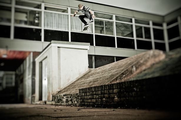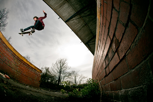 Benjamin ‘Champagne Supergrover’ Grove needs no introduction so I won’t bother with one. We all know he likes to take his top off and is in possession of a bloody good kickflip. Luckily it was a bit cold for ‘Terry Tough Tits’ on this grey day in Stockport, plus a fart stone in the wrong place and Terry’s tits would have copped some nasty road rash. A run and jump, throw down, gap flip to quick drop off is pretty difficult in itself without having to worry about falling into a load of needles! I can’t remember whether this trick is in Manchester videos ‘Keep Keen’ or ‘Pusherman’. Both have banging Ben Grove parts so I highly recommend you purchase said videos pronto. Cheers our kid!