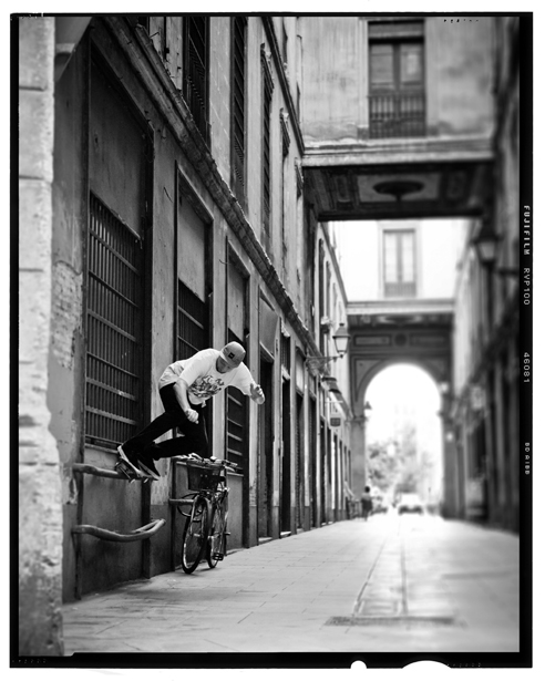 During a DC sales conference in Barca, I hooked up with Danny Wainwright for the day. He skated, I shot photos and we both drank café con leche. The spot we actually had in mind to skate was a jersey barrier near his apartment but it turned out that a van was parked a little too close to get a decent line for the trick he wanted to do. Never mind because a quick scout of the surrounding streets provided a couple more ‘spots’. I say this a little tentatively because to most skaters a curb cut kicker to a 5 foot high ledge and this waist high bar far too close to a wall for comfort wouldn’t really have registered. Not a problem for ‘Drainpipe’ and his springy Dad legs though.
