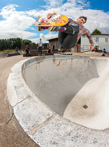 With the remaining residue from the down-pour of the previous day hindering the session slightly, the pool was kindly pumped out by Romford legend Dion. Having shot a backside crail block and an invert within five minutes of the pool being dry enough to skate, Lance began trying to get the line for a frontside air. I managed to get four or five photos of this whilst he was trying to get the line to go higher and before too long he reached terminal velocity with this particular frame. F*cking stoked – a Lance Mountain photo and it made its way onto the cover of the Buyer’s Guide a few months later.