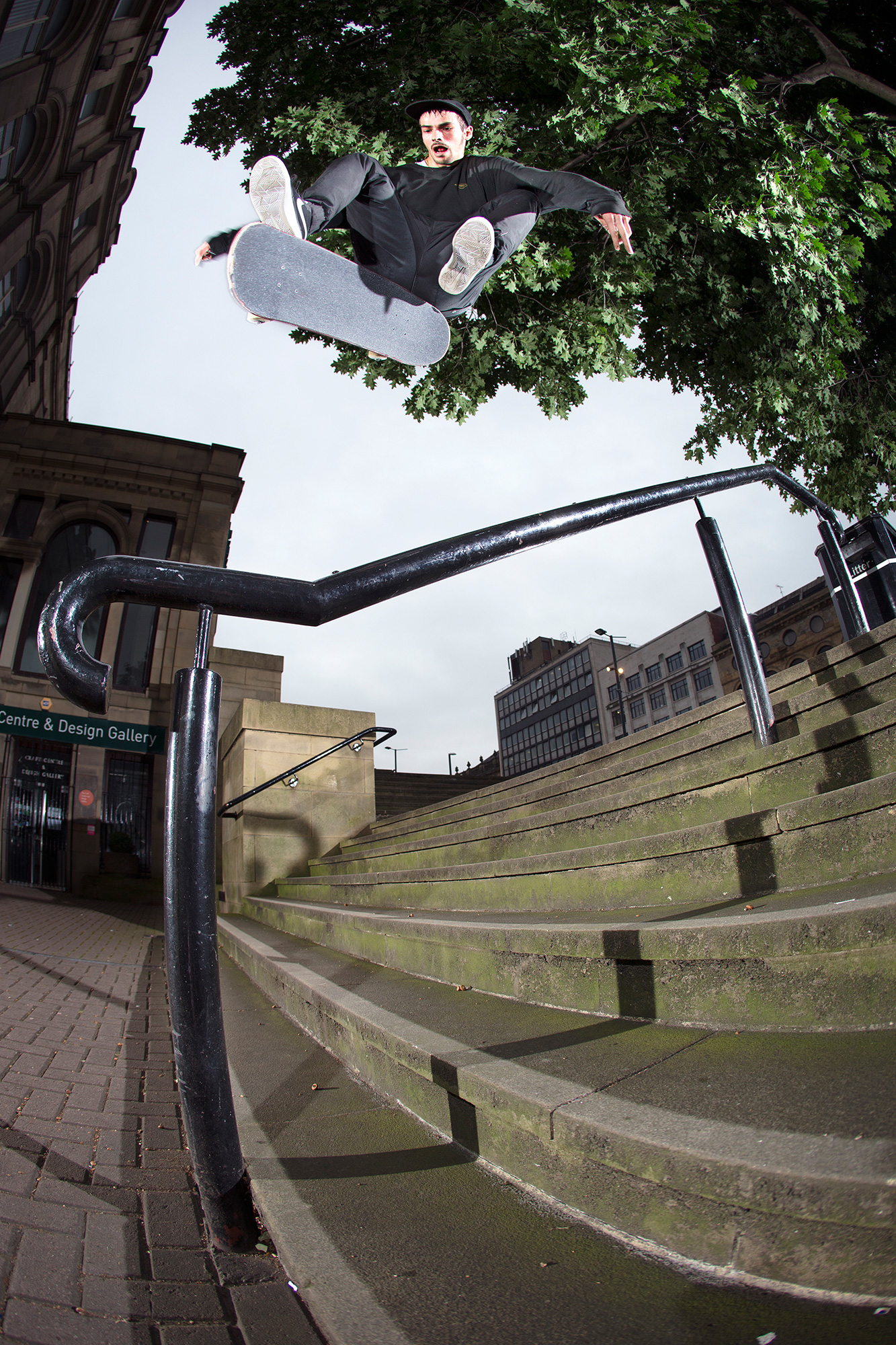 As is often the way, after an exhaustive tour of Leeds’ main skate spots and either a quick boot from security or no takers amongst the crew, Dakota decided he wanted to skate something that wasn’t ‘a spot’. He bombed the hill before launching this long distance kickflip off the kicker and over ledge and stairs. Although I was shooting the photo from over 20 feet away, Dakota was going so fast he almost ran me over.