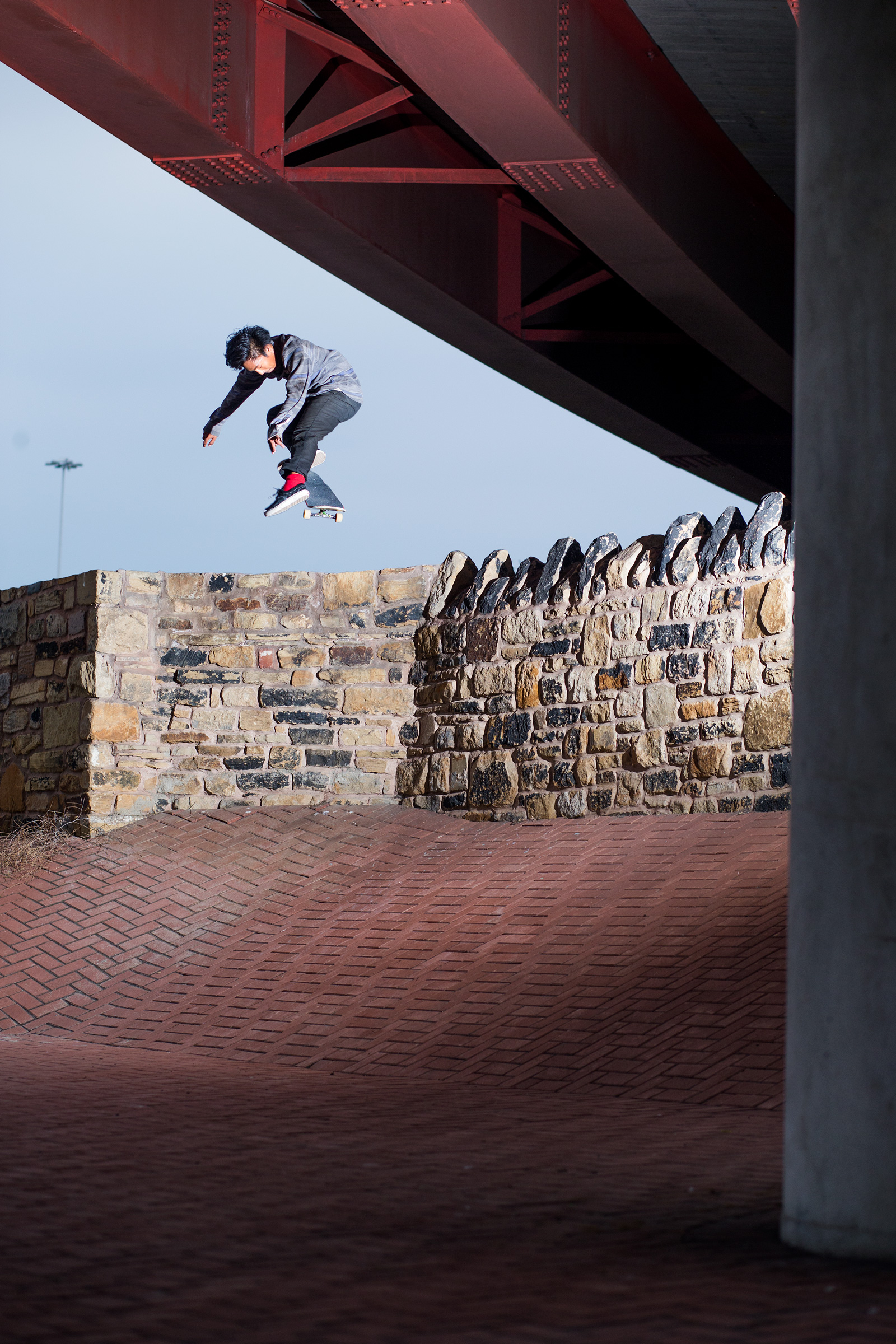Classic DD ninja feet action as he brings a heelflip into line before the inevitable brickweave rattle out. Photo Reece Leung.