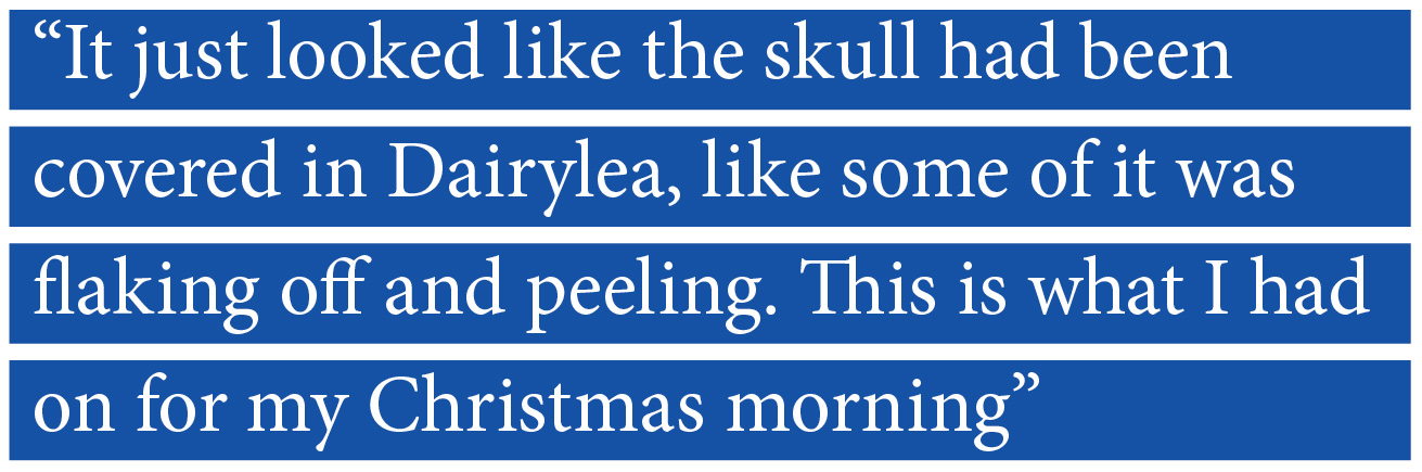 We got through to the flags, lifted them off and the body was there. It was squashed up to the top of the tomb because of all the water in the grave, it still had the cloth wrapped around it, it had rotted away a little bit, and there was a bit of the skull coming through the side…it was just strange to see it floating there. My boss had the job to get the coffin straps that you’d use to lower the body into the grave underneath the body in order to pull it out, so he had to pass his arms underneath it, and he looked like he was hugging it. At one point his face was really close to the face of the skull. The skull as well, to say that it had been down there for five years or so, the skin was still on the skull but it just looked like the skull had been covered in Dairylea, like some of it was flaking off and peeling. This is what I had on for my Christmas morning. My boss sent me down to get some water to clean out the spot with, and some of the people were a bit jumpy as well, with it being an open grave. So I got him this bucket of water and passed it straight under the tarpaulin but everyone’s stood with their back to it and is it comes passed underneath I think it splashed a few people and gave everyone a right shock, and everyone started screaming; all these funeral directors and the police all yelping and screaming…I was laughing my head off at that.