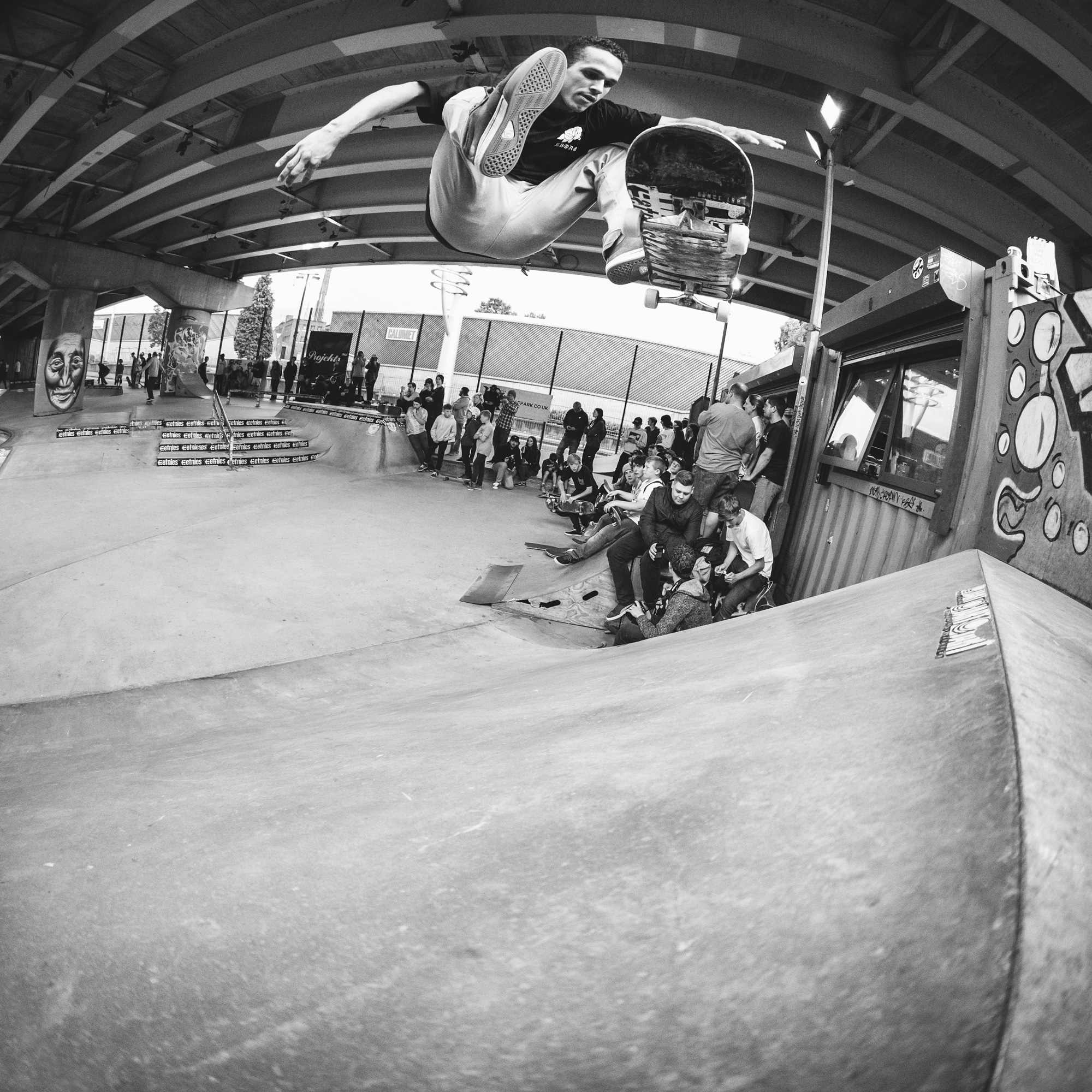 After countless hours of crawling our through the strangled motorway networks of the South West, we finally arrived in Bristol to a heavy crowd outside Route One and the signing soon got underway. By the time we made it over to Dean Lane skatepark, it looked like every skateboarder in the immediate area had made it out to see the show. Following the natural flow of the park, the session consisted of lines from the top to the bottom of the hill, all the while being filmed by Manzoori and other members of the crew in order to put together an Insta clip later that evening. The highlight for the crowd was also the low point for Chris Joslin as he attempted to backside flip the pyramid to flat. For those of you that have been there and seen the scale of what we’re talking about here, yes, to flat! Despite sliding out on a near make, Chris wrote himself off when on the final attempt he went the full length and height straight to his heels. As the light was all but gone and the demo drew to a close, Trevor session’d the transitions in the lower end of the park and got this lofty frontside air before we called it a day.
