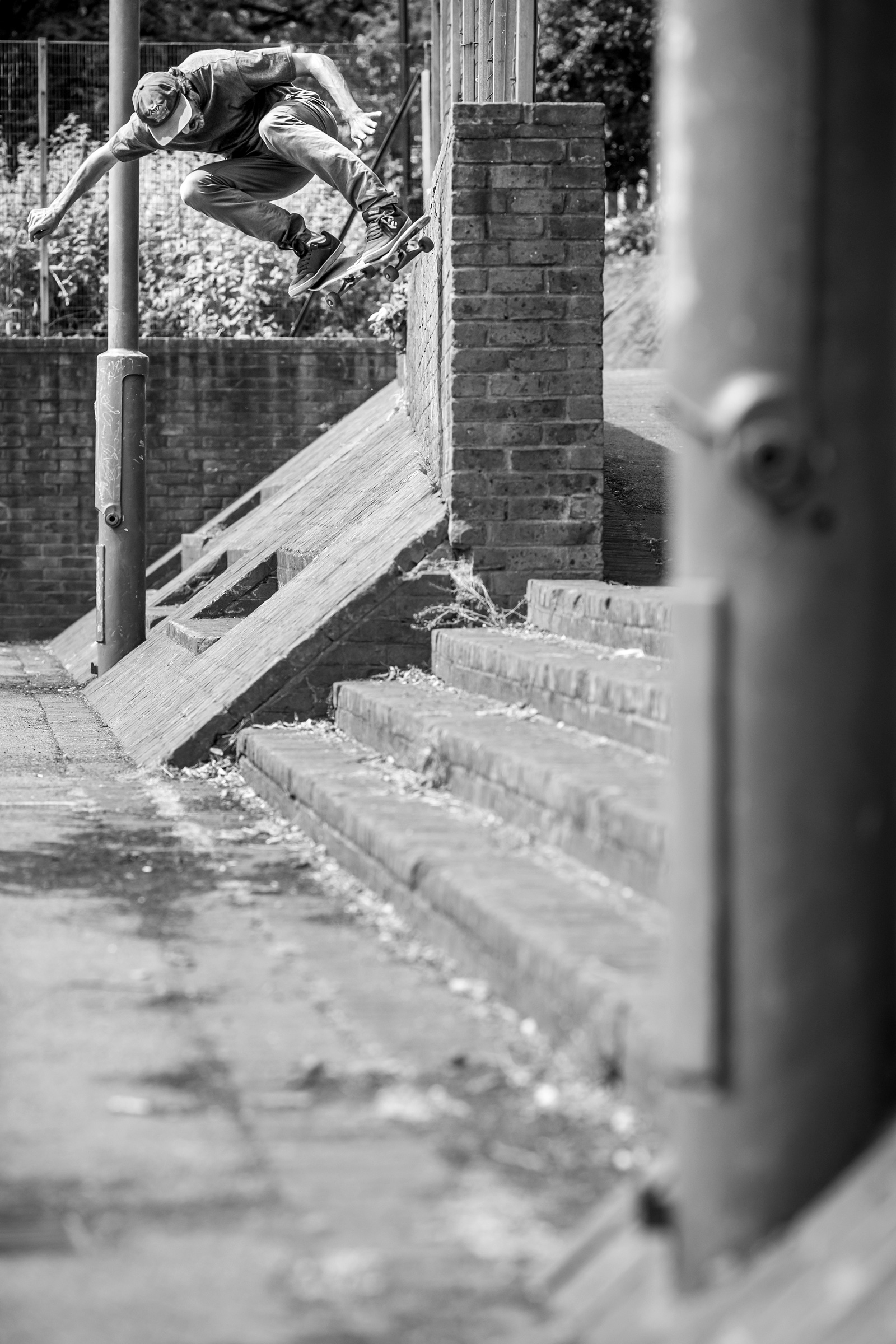 Having a deep interest in and knowledge of UK skateboarding, Ryan Lay knew exactly what was on the cards when Little Lloyds came into conversation. With so many tricks being racked up on the ledges over the past decades, Ryan gravitated to the lesser-skated ‘bank to rail’. By the time the rest of us were making our way back over from the neighboring Starbucks and the Pasty Shop, Ryan had already constructed the makeshift addition to the spot. Using part of a broken slab which lay discarded at the foot of the adjacent stair set, he got this ollie up (the gap at the foot of the bank), wallie hippie jump within a handful of tries and proceeded to bang them out of repeat until all the media forces were satisfied.