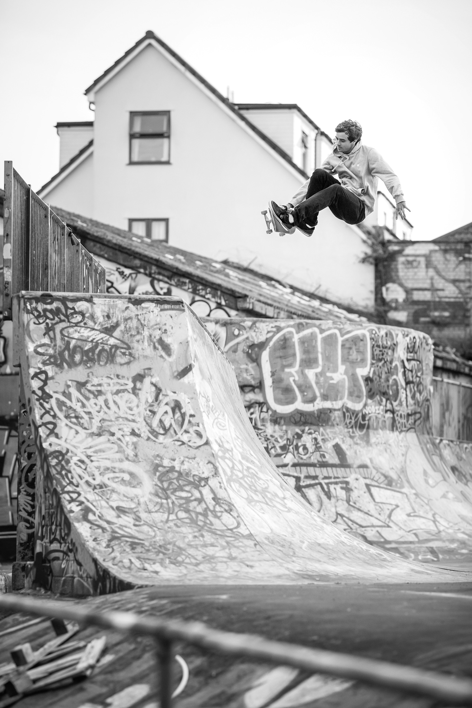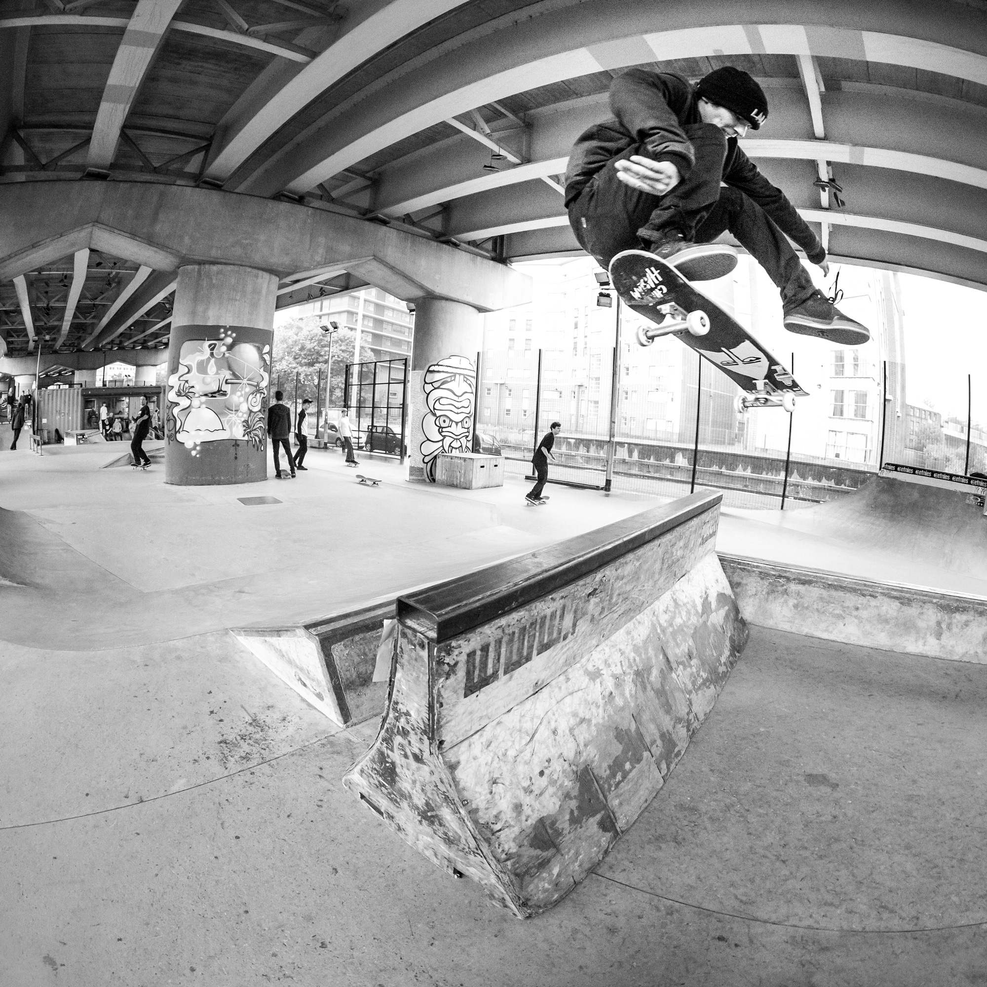 Barney spent the majority of his time in the UK trying to adapt to a new set of trucks as he’d focused his hanger during a heated mind melt attempting the frontside blunt in Archway. Finally getting to grips with his undercarriage, Barney popped out of the flat bank to lofty frontside wallride on the slippery fence surrounding the park.