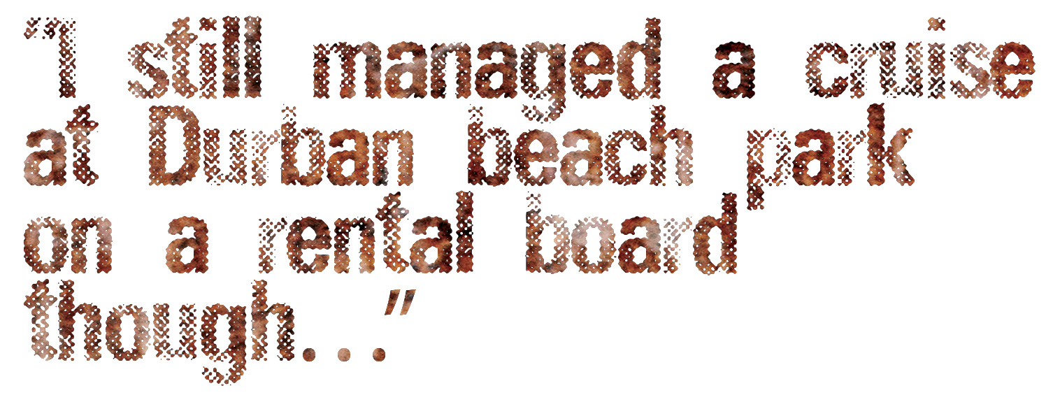 Yeah man, I was in South Africa. We’ve got some family over there that we didn’t see last year when we went to Zimbabwe, so we had another trip out for them. We were in Johannesburg for the first week and a half, then Durban for 3 days and then Vereeniging for the last week. Just the usual holiday stuff, I had hurt the ligaments in both my feet like 3 weeks before we went so it was good to just not be tempted to try and skate everyday. I still managed a cruise at Durban beach park on a rental board though…
