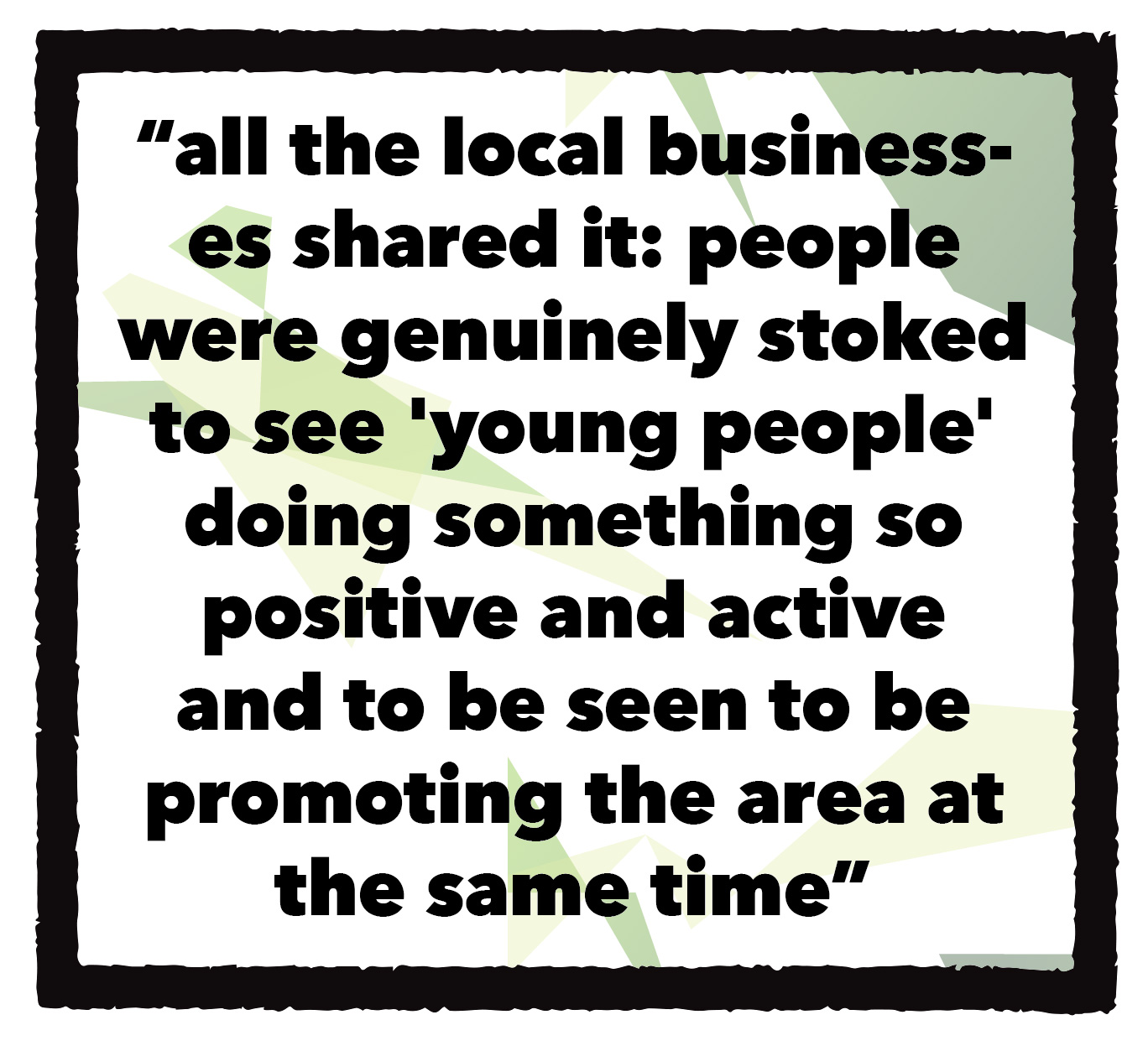 Oh yeah all the local businesses shared it: people were genuinely stoked to see ‘young people’ doing something so positive and active and to be seen to be promoting the area at the same time. Even when we were out filming because we had a big crew we attracted a lot of attention but people were so into what we were doing. I know skaters still get hassled a lot but skateboarding is generally viewed as something a lot more positive than it was when I started.
