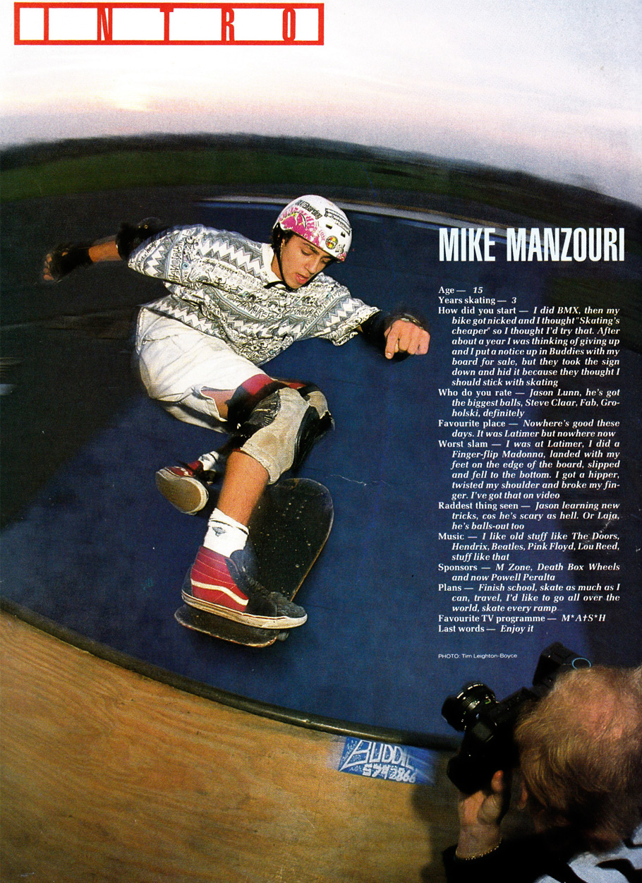 You’ve been around getting coverage since modern UK coverage began, and your first cover (Sk8 Action, February 1990) and your RAD intro (January 1990) were alternate angles of the same trick. Have you ever been conscious of how your skateboarding is perceived? Did you ever feel the need to put in ‘Mike Manzoori tricks’, or ‘Mike Manzoori spots’, or is it just natural?