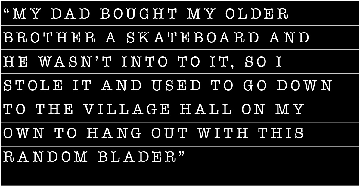 Before Harrogate I lived in this tiny village called East Keswick. My dad bought my older brother a skateboard and he wasn’t into to it, so I stole it and used to go down to the village hall on my own to hang out with this random blader.