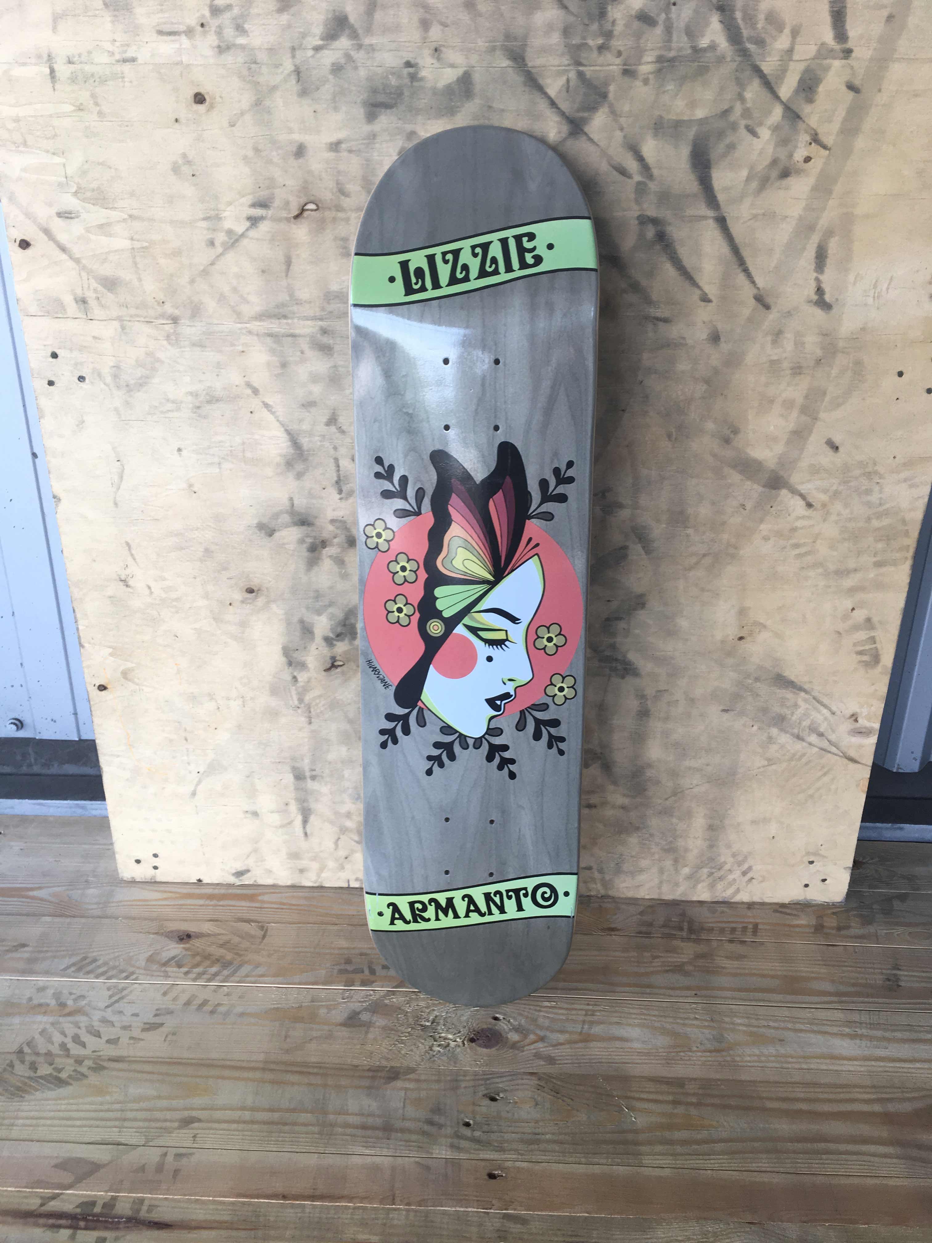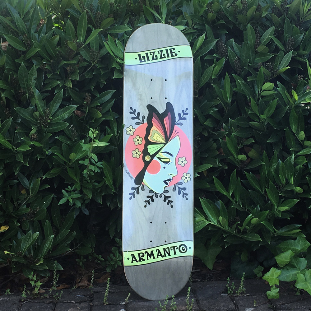 Lizzie’s Butterfly pro model comes (as above) on various stained veneers, with top and bottom graphic and runs the familiar Birdhouse concave. Size-wise this one comes in at a relatively diminutive 32″ in length by 8″ width.