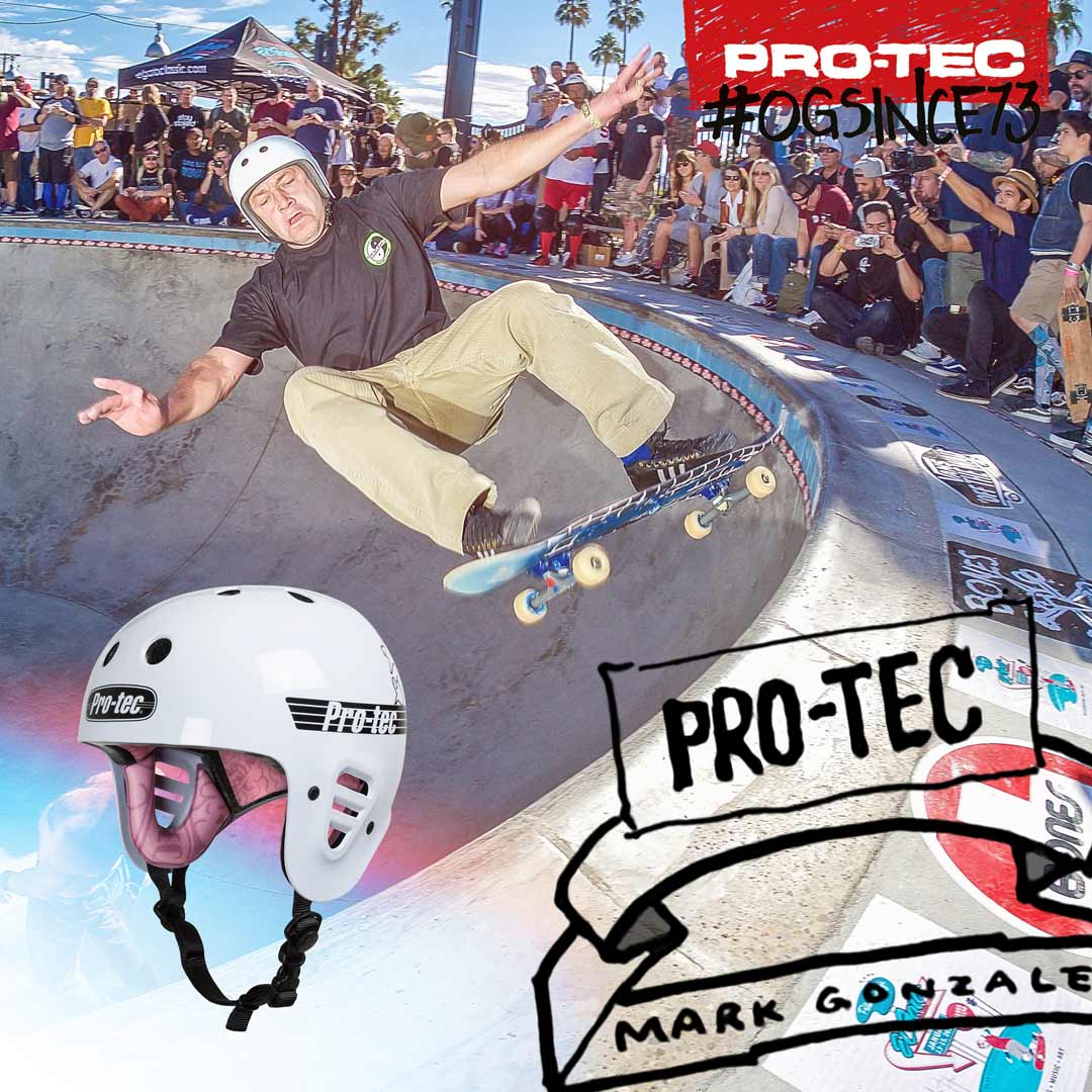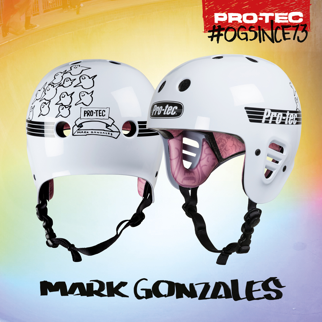 As a skate legend rapidly approaching his 50’s it seems fitting that Mark Gonzales should be the inspiration behind the latest release from OG skateboard safety gear brand Pro-Tec, in the form of this new customised iteration of their classic Full Cut skate helmet.