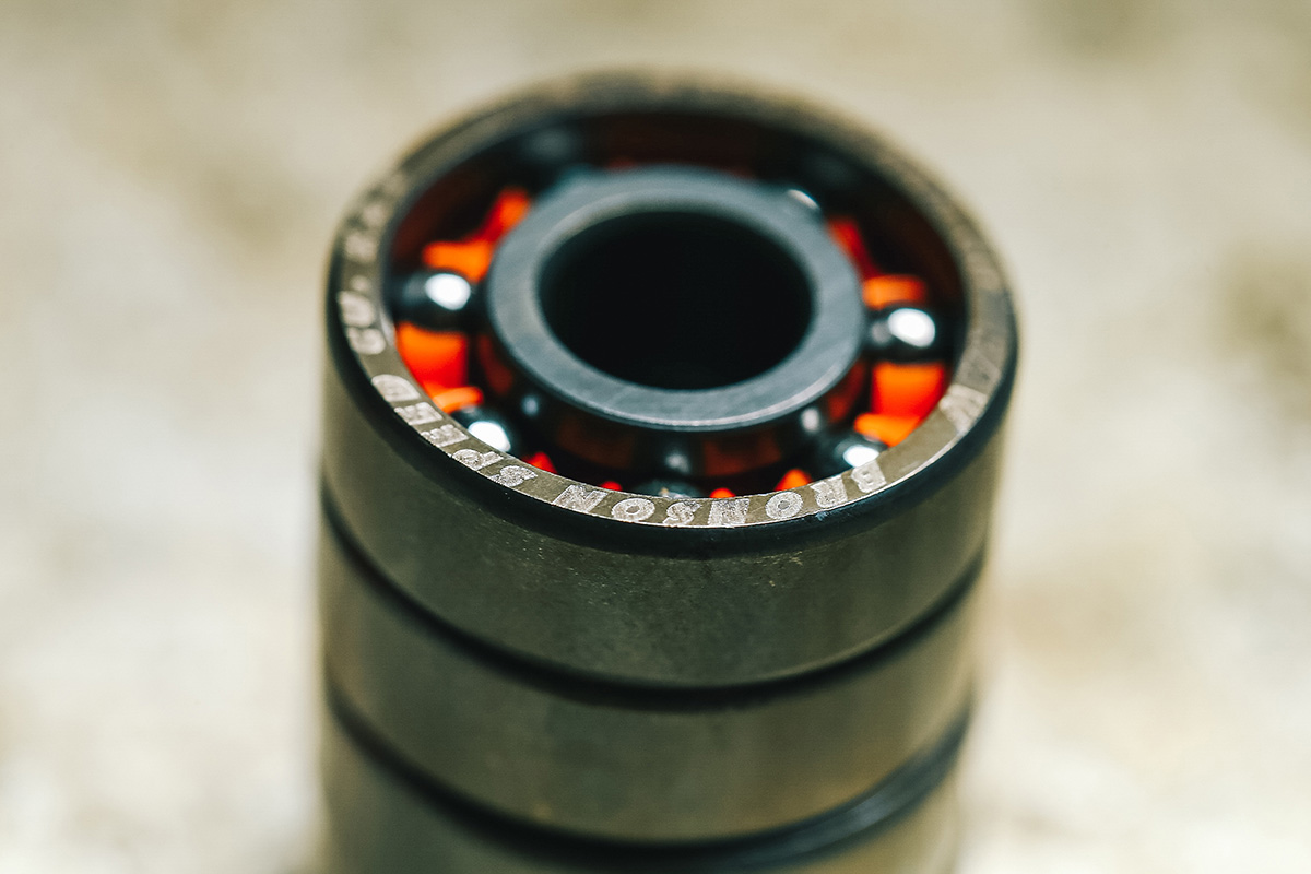 The Bronson Speed Co RAW Shieldless bearing removes this problem entirely allowing you full access to clean your bearings as they need it. Internally the Bronson Raw Shieldless bearings are on the cutting edge too, with a micro thin tungsten dry lubricant coating on the deep-cut races (the channels that the ball bearings roll along – deeper races means a more consistent bearing movement), and a fiberglass filled orange nylon cage that hold the individual ball bearings.