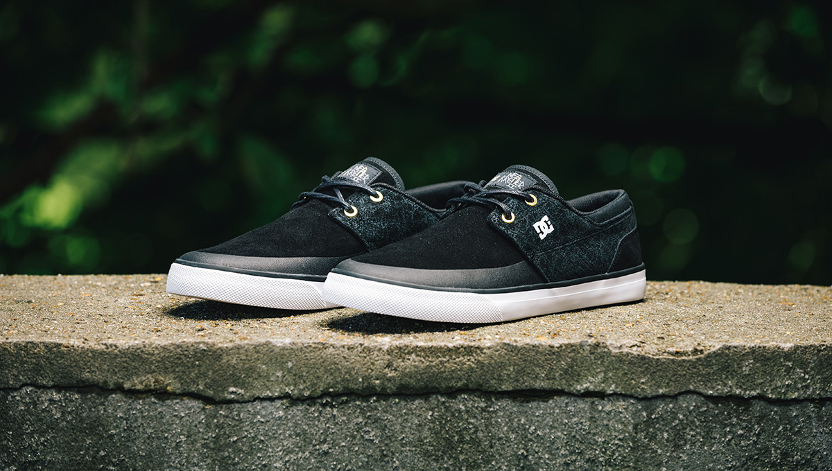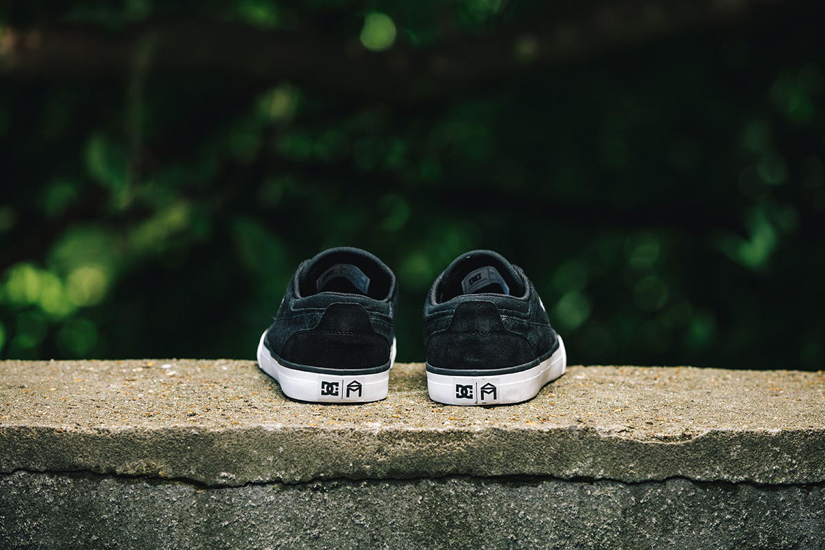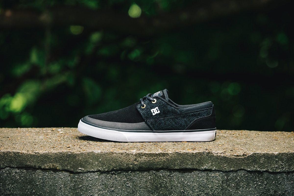 DC Shoes have once again collaborated with Wes’ board sponsor SK8MAFIA and thus, logos of both brands decorate the heel tab of the shoe alongside a custom embroidered tongue tag topped off with gold highlights and co-branded gold lace eyelets.