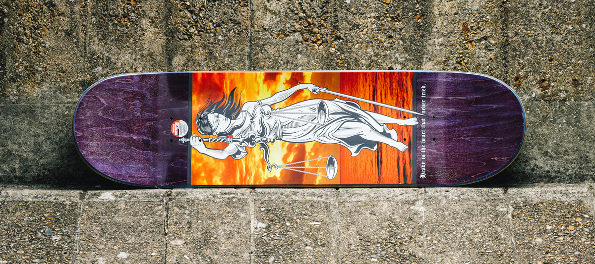 This Real Skateboards ‘Heavyweights’ board reflects this legacy with the main bottom graphic emblazoned with the original Real logo and the top graphic reflecting Real’s aesthetic legacy and political outlook with the legend ‘Heavy is the heart who never tried’. Size-wise it comes in at a slightly larger than market-average 8.5” width on a virtually symmetrical popsicle shape with a wide nose and slightly shorter tail.