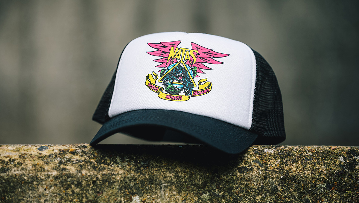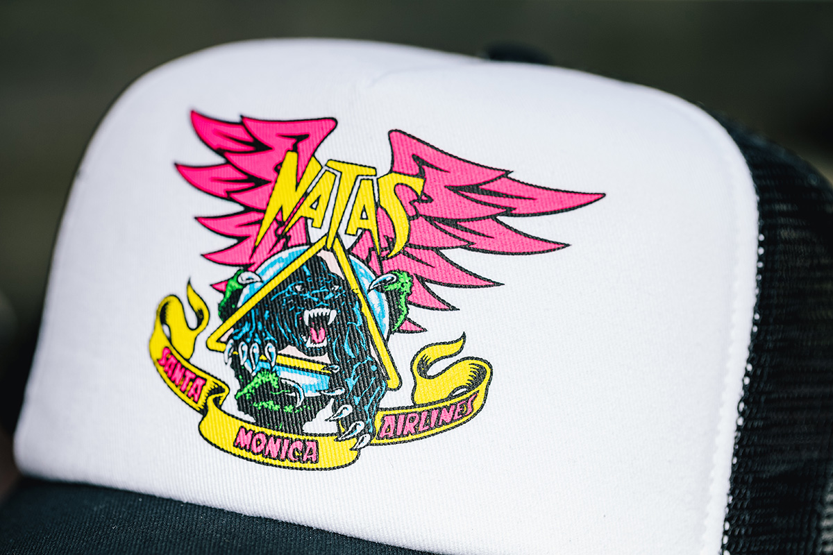The Santa Cruz Skateboards – SMA Natas Kaupas Panther Trucker Cap that you see here is the latest in Santa Cruz’s line of classic reissues featuring Kevin Ancell’s legendary artwork printed on a white foam filled front panel.