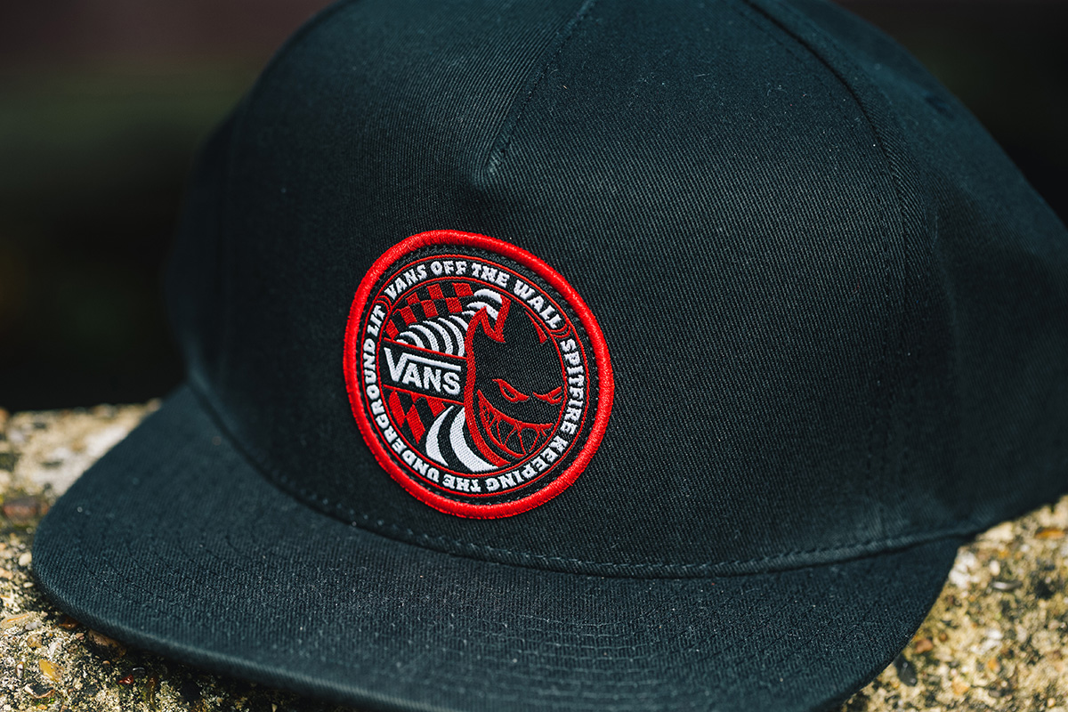 Emblazoned with a red, white and black merrowed edge patch on the front with iterations of the classic Spitfire ‘Bighead’ logo, the black and white swirl logo and a red and black checkerboard Vans design complete with classic Vans logo, this is the perfect marriage of two of the best. Additionally, the cap’s patch comes complete with an amalgam of both brand’s bylines with ‘Vans Off the Wall’ and ‘Spitfire Keeping the Underground Lit’ adorning the edges of the badge.