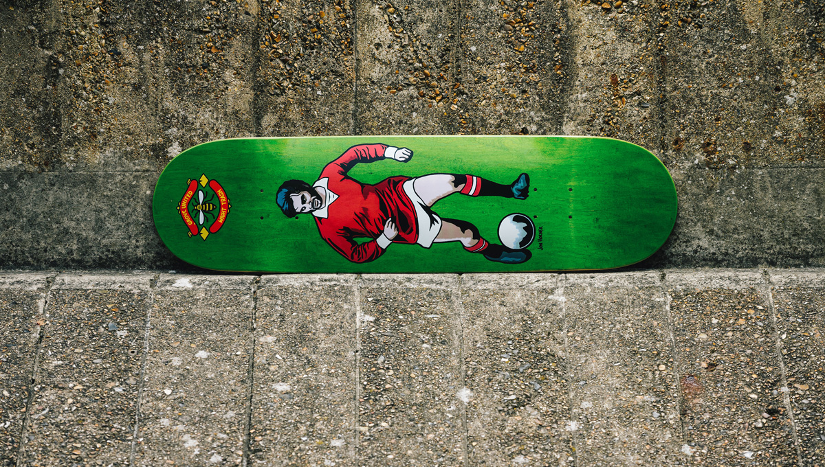 So whether you want to whip your shirt off and nosepick the tallest surface at your local park like Grove at NASS, or scoop a backside 180 down your nearest hero gap with Oasis ringing in your ears like you’ve just scored the closing section of ‘Pusherman’, if you’re a fan of boards with a steady width and a mellow kick then this is the deck for you. And if you like football as well, that’s just an added bonus.