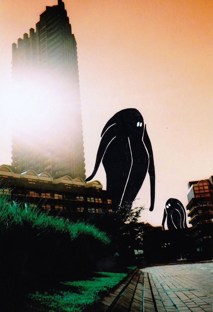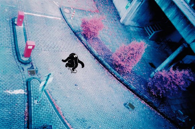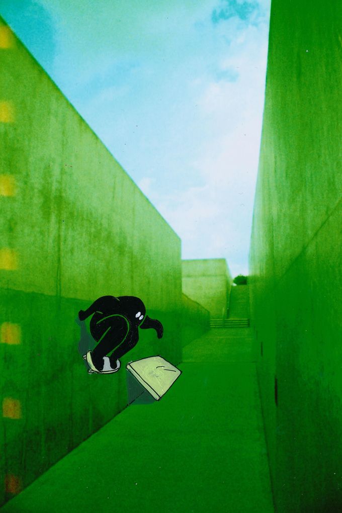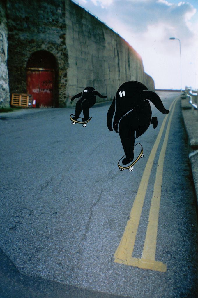 ‘623’ is a collaborative exhibition by London-based artists Tracy Gray and Eloise Dörr. The work in the show is analogue photography of (predominantly) Brutalist architecture shot by Gray, which is then embellished with ink and acrylic paint by Dörr. The scenes captured portray strong, geometric shapes that make the perfect playground for Dörr’s skateboarding silhouette characters. Both artists have an interest in skateboarding, and the locations depicted are perfect for it. In many of these locations skateboarding is prohibited, and in this exhibition the artists have artificially created a world in which it is unrestricted and free.