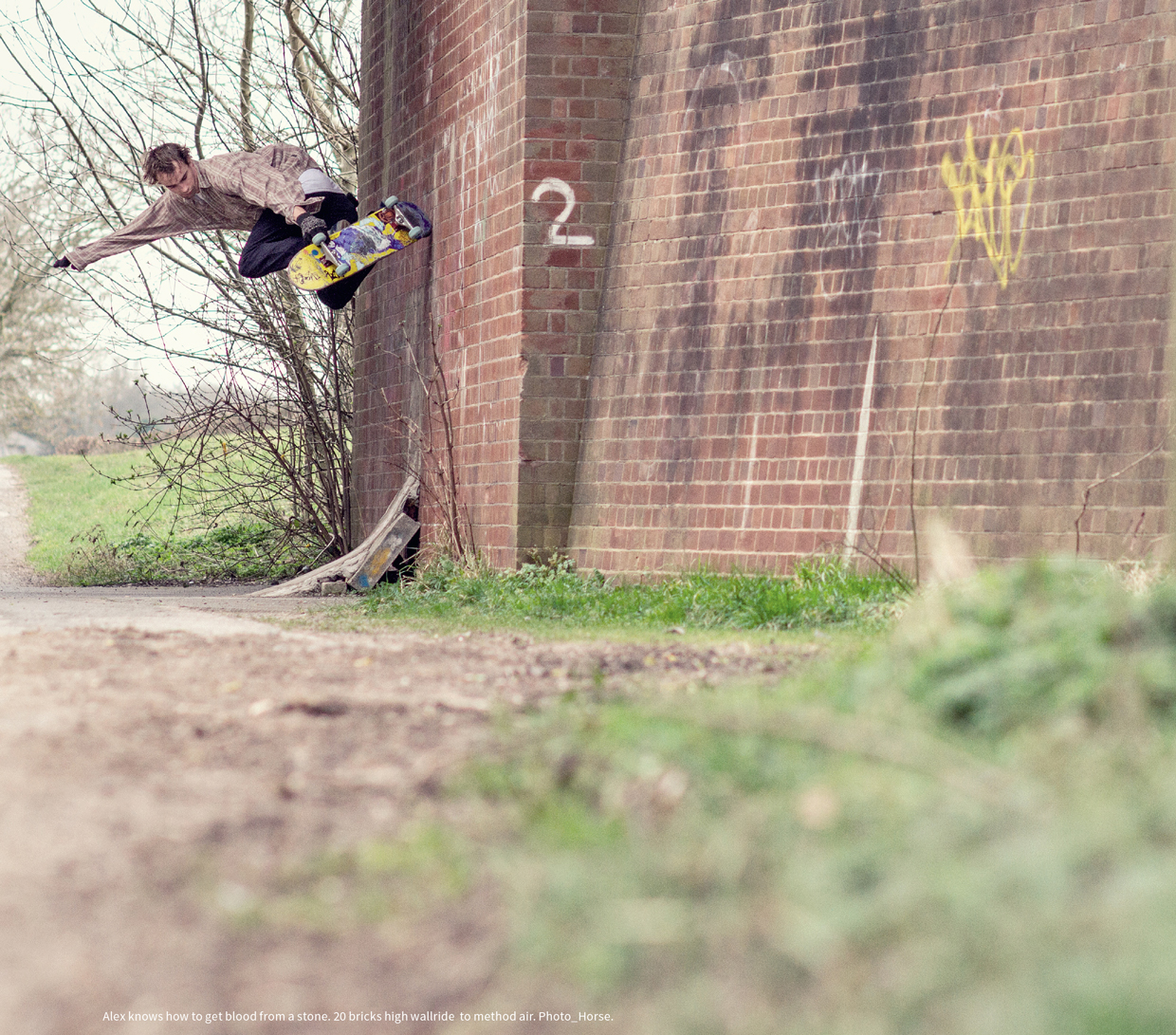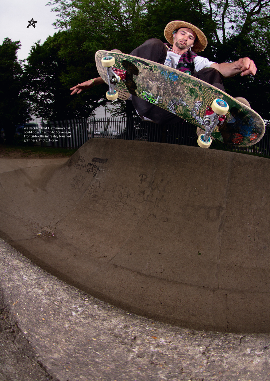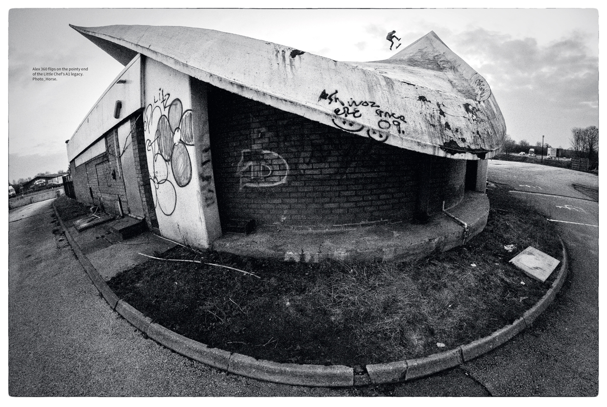 I first met Alex a couple of years back in an abandoned mill at the arse end of a Nottingham industrial estate. He was busy clearing the run up to a sketchy wall ride, sweeping twenty year’s worth of rancid pigeon shit and decay from the floor of the unventilated room directly into his unprotected lungs. It was clear I was in the presence of someone special. Alex has a loose approach to health and safety. Maybe this comes from spending his formative years shredding vert with some of the gnarliest skaters on the British scene or maybe he inherited some kind of danger gene from his folks.