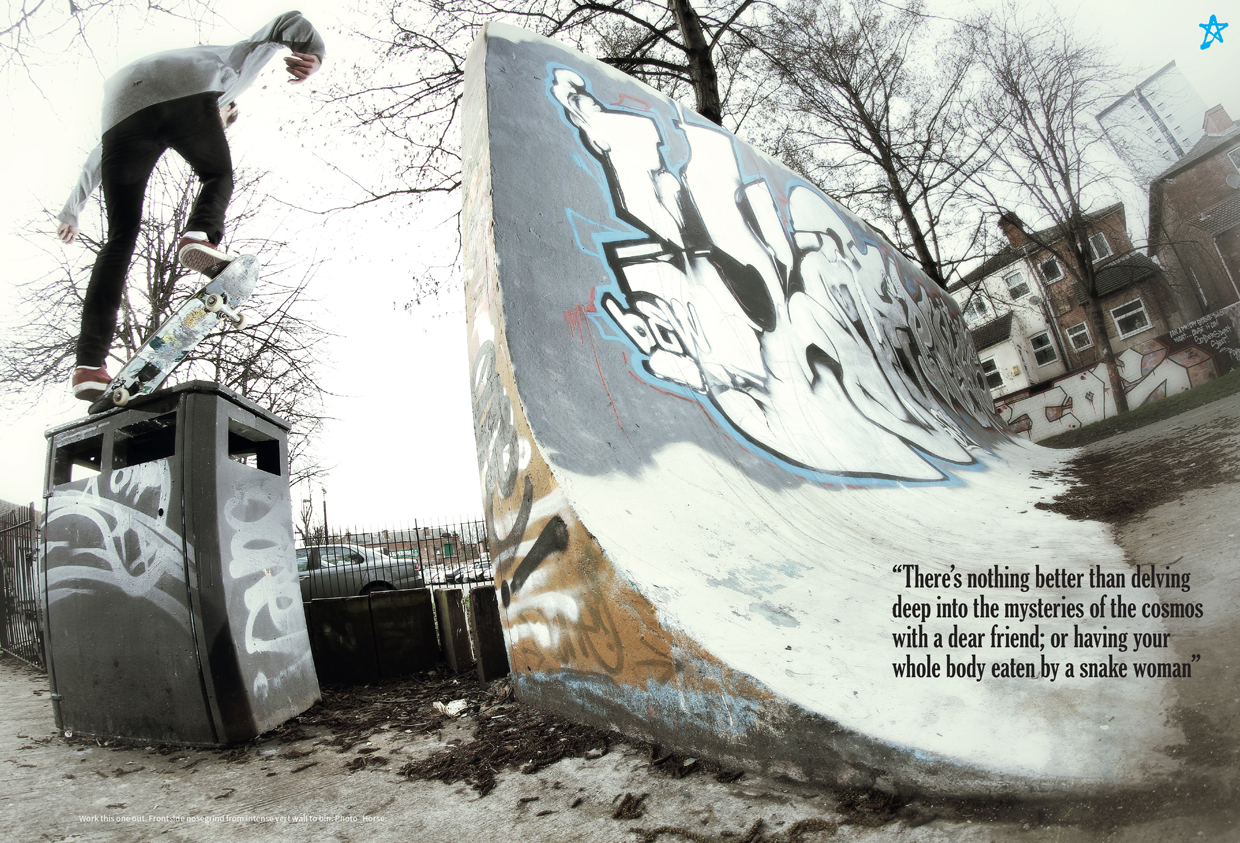 for people, not to mention an amazing place to session. There are plenty of street spots and more skaters here than ever. Fortytwo skate shop has had a very positive influence on the scene too. Since they opened they’ve provided sponsorship and support to many local skaters and have been very proactive in getting the younger skaters and beginners involved and enthusiastic about the scene. They’ve also been putting on monthly competitions at various parks around Nottingham over the summer, which is a good way of getting people together and having a laugh. There’ve been a lot of new parks popping up too so that’s been great for the scene as well.