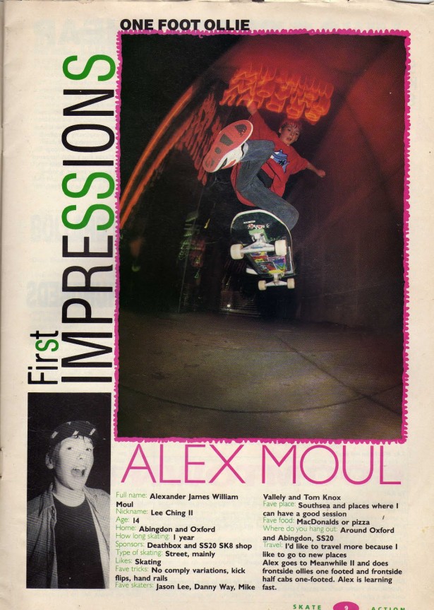 The “Pipe Dream Reality” blog have dug out Oxford legend Alex Moul’s “First Impressions” from Skate Action magazine, taken way back day in the day when Alex was a 14 year old nipper.