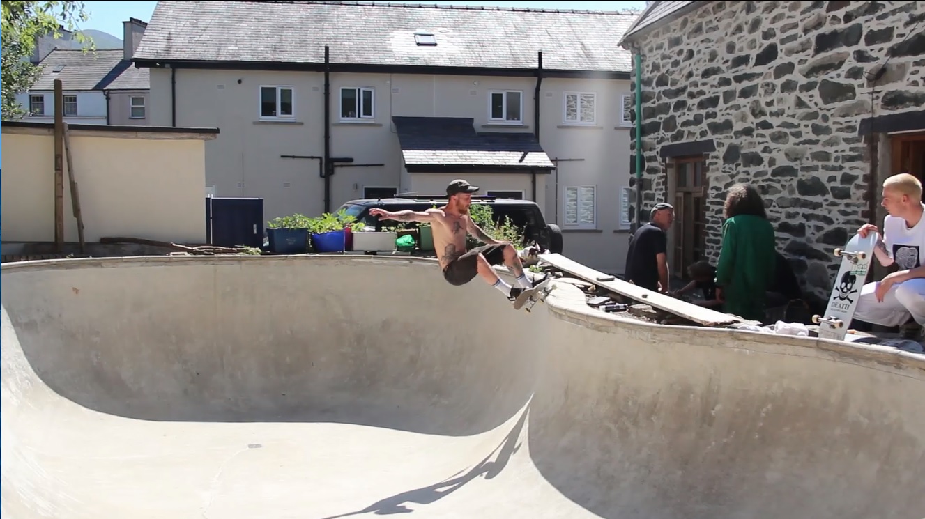 While the Italian contingent headed out on the town in Liverpool (we left them bemusedly staring down a cataclysmically pissed bloke waving his fists at them in the manner of a 19th century gentleman boxer) the rest of us drove over to our pal Rob’s, where his beaut of a backyard pool sat overlooked by the local cemetery for added gothic vibes. This thing is gnarly and, while skating it first thing in the morning may not have been my wisest decision, it definitely woke me up. The transition to vert ratio definitely puts this in the pool category even if it is purpose built, with slams to flat an absolute guarantee. Filippo and Andrea made it over from Liverpool to report in their lack of success with the opposite sex and, after a morning’s session in the garden followed by a trip up into the hills to hide from the heat of the day at a local diving spot, we bombed some fairly hairy country lanes back into town and headed out to Bangor.