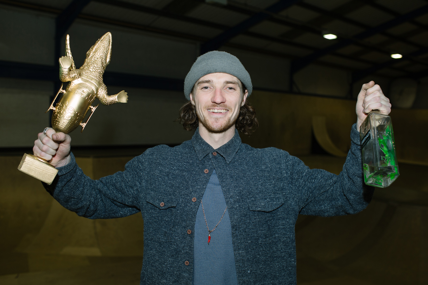 We celebrated Kris’s driveway win by sampling the sensual sounds of ‘Goblins’, before moving onto the Vert Wall. The Welsh contingent got well and truly involved with Jake Collins smashing a frontside wallplant and going back into the ramp with no hands. But it was Manchester/Kidderminster local lad Cam Edwards who took this one with numerous death defying manoeuvres including a dungaree clad back boneless to fakie.