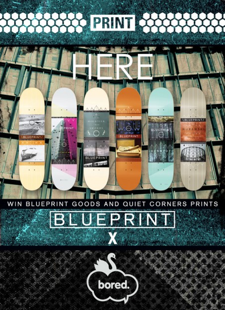 All you budding photographers out there, this is the comp for you! Off the back of their recent collaboration board series, Blueprint and Quiet Corners have joined forces with Bored skate store to give you the chance to get your mitts on some signed Quiet Corners prints and Blueprint gear. To be in with a chance of winning one of the three prizes on offer, you need to submit your favorite photo that you’ve taken to the “Print Here” blog – http://printherecompetition.blogspot.com – you’ve got until November 30th to do so, so get on the case now!