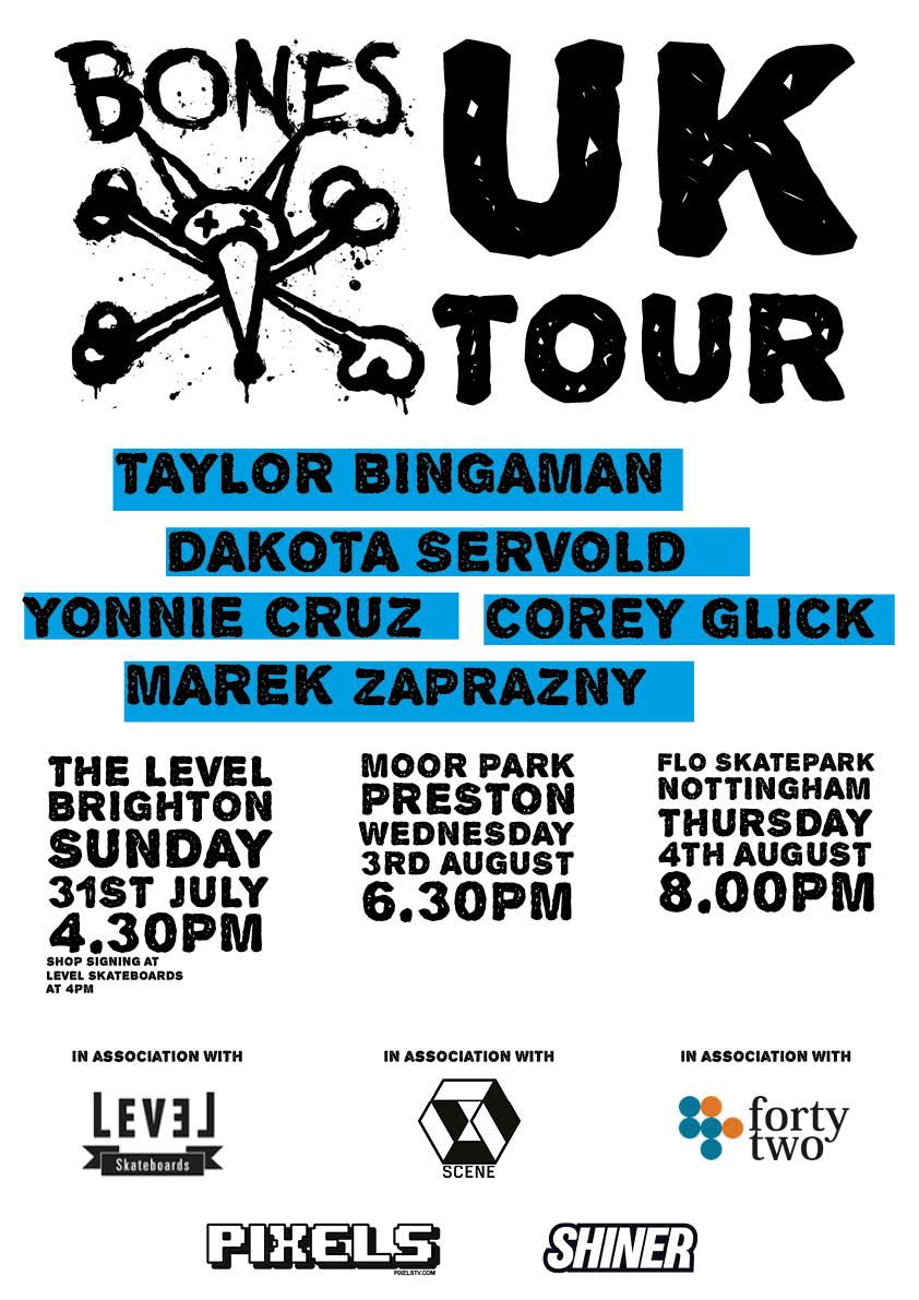 The Bones Wheels UK Tour will be heading through Brighton, Preston and Nottingham this Summer, kicking off at the end of this month into the beginning of August. Taylor Bingaman, Dakota Servold, Yonnie Cruz, Corey Glick and Marek Zaprazny will hit Brighton on July 31st for a shop signing at The Level Skateshop before a demo at the park itself, Preston to skate Moor Park on August 3rd, an Flo in Nottingham on the 4th. Peep times below and, if you find yourself in one or more of these areas at the corresponding times, go see some shredding!
