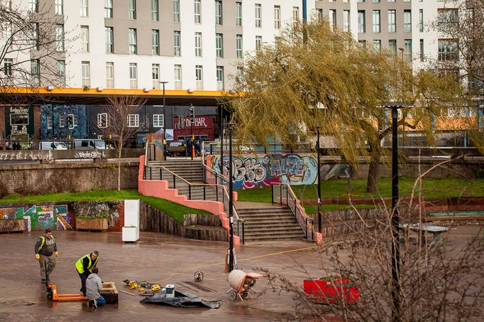 Bristol’s ledge count just jumped up by one with the addition of a perfect new number located in the ‘Bear Pit’ courtesy of the hard work and commitment of the guys at Canvas. Skaters have always hung out in this space, in the centre of a roundabout but with its recent resurfacing, it has now become a ‘proper spot’. The local powers that be saw this and decided to allocate some money towards building something specific to skate within the space. Thanks to Canvas skateparks and for very little cost, the skaters of Bristol now have a perfect bit of MACBA on their door step just in time for the good weather.