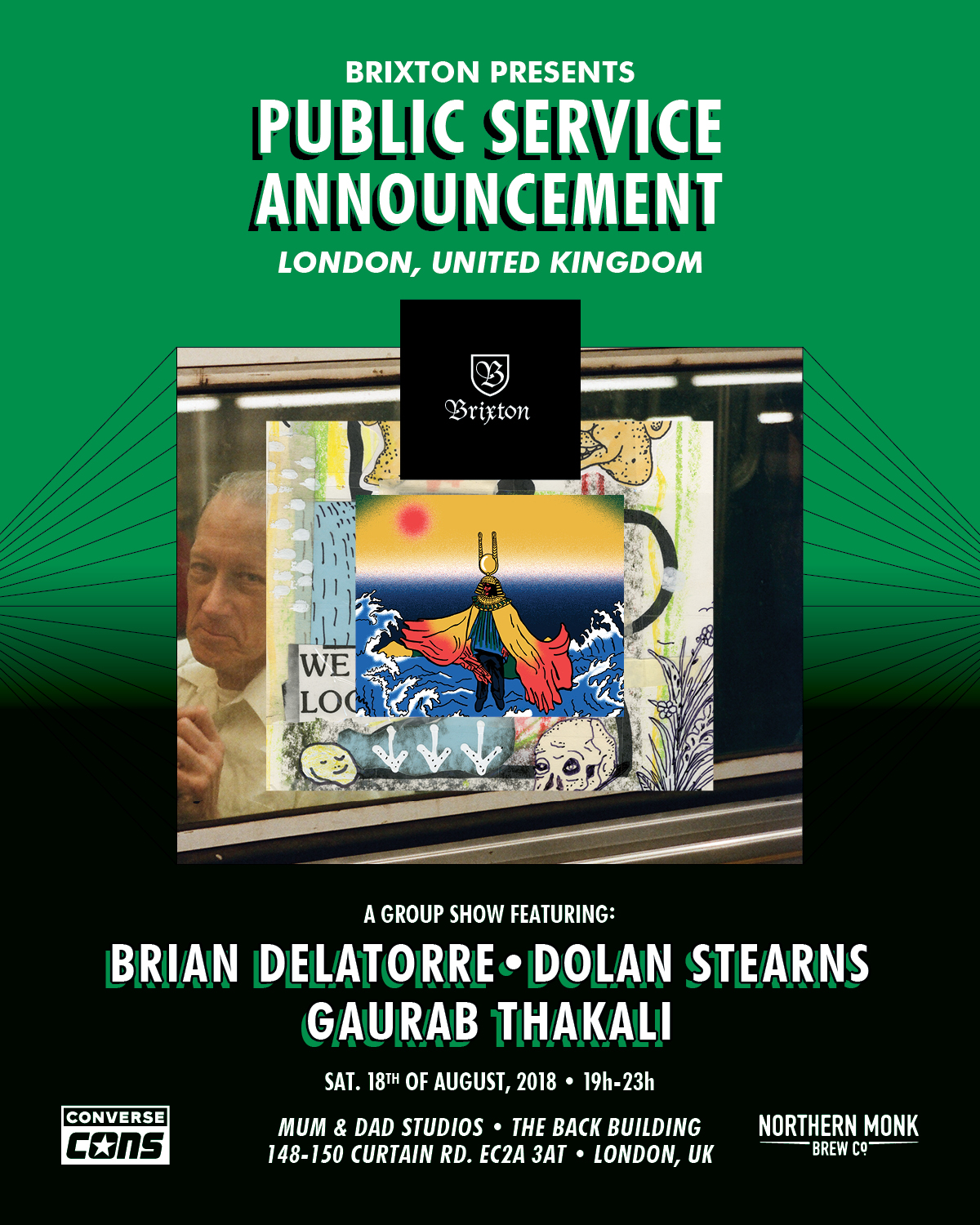 “Brixton presents Public Service Announcement, a travelling art series with stops also in Paris and Berlin, featuring Brixton ambassadors Brian Delatorre, Dolan Stearns and Guarab Thakali who will all be in attendance, alongside local artists, illustrators, photographers, skaters and more.”