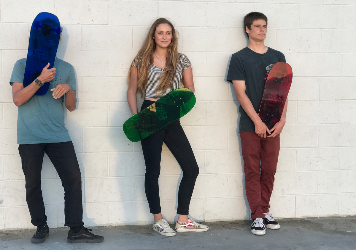 The skateboard feels like you are surfing the streets. It has just the right flexibility. We added shock pads and risers to prevent wheel bite. Even though it looks like it would be slick, there is enough grip even without grip tape to perform tricks. It’s the perfect board for riding to and from school. And, being able to see right through the board is very cool, especially at night with the lighted wheels.