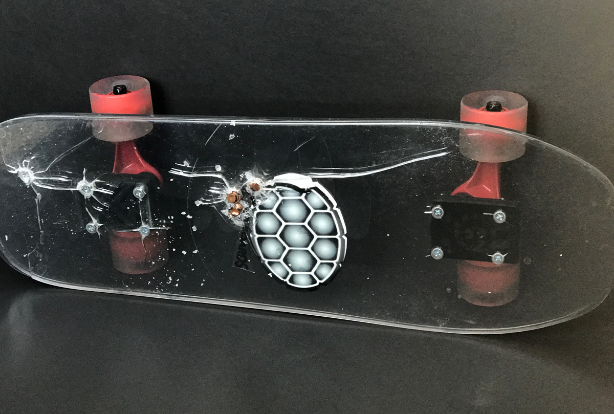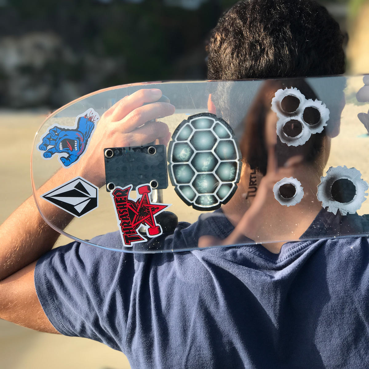 Turtle Boards are the only bulletproof skateboards that can be used as a shield in a school shooting. The proprietary technology has been extensively tested by firearm experts and law enforcement. “I was extremely impressed the skateboard stopped multiple full metal jacket (FMJ) and jacketed hollow-point (JHP) rounds using a 9 mm, .38, .45, .357 and even a .44 Magnum with no penetration,” said Mark Anderson, Range Manager of FT3 Tactical in Stanton, CA.