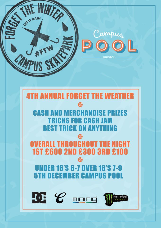 Winter might be kicking in, but luckily Campus Pool has your back this coming Saturday with their fourth annual FTW jam. With over £1200 prize money up for grabs and the still fairly new concrete to get stuck in on, this one is sure to go off! Check the flyer for details, click through to go to the event page and stick it in your diaries…