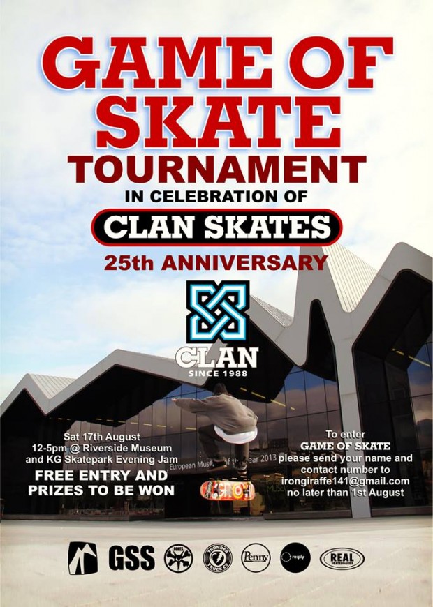 Clan Skateshop in Glasgow are celebrating their quarter of a century this coming Saturday with a no doubt epic Game of SKATE outside the skateboard-friendly Transport Museum.