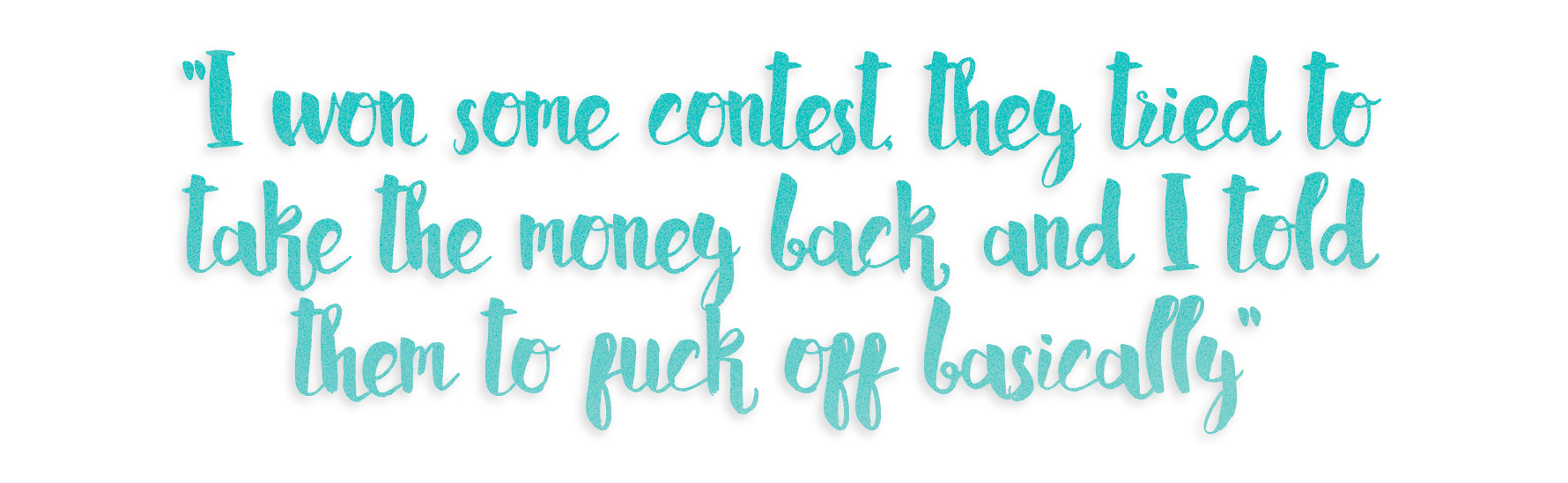 Oh that was some bullshit…I won some contest, they tried to take the money back, and I told them to fuck off basically…