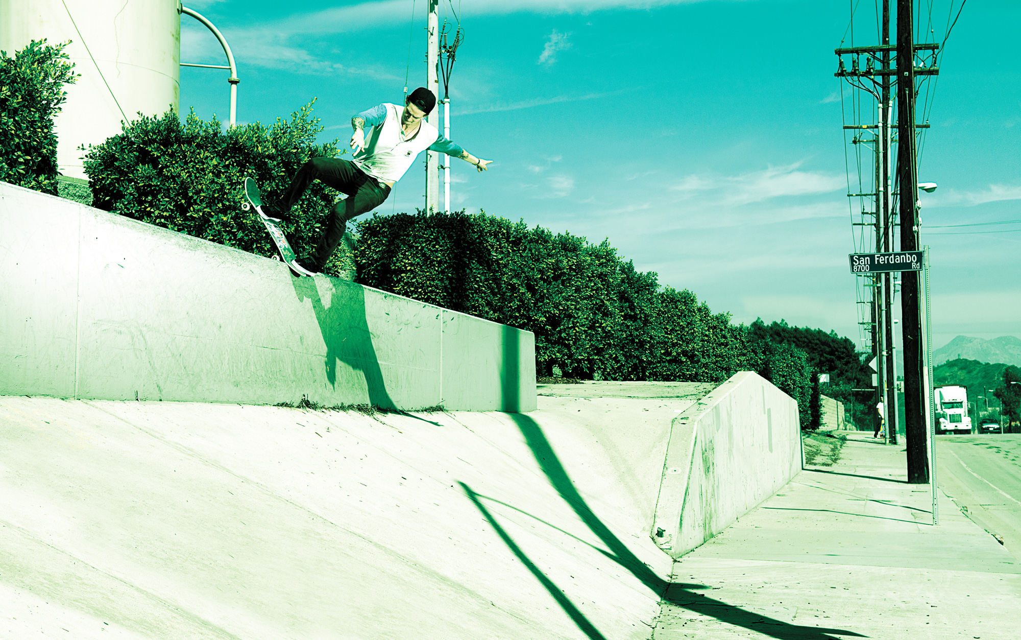Collin backside bluntslides on a classic Californian set up. You can almost hear the screech. Photo courtesy of Emerica