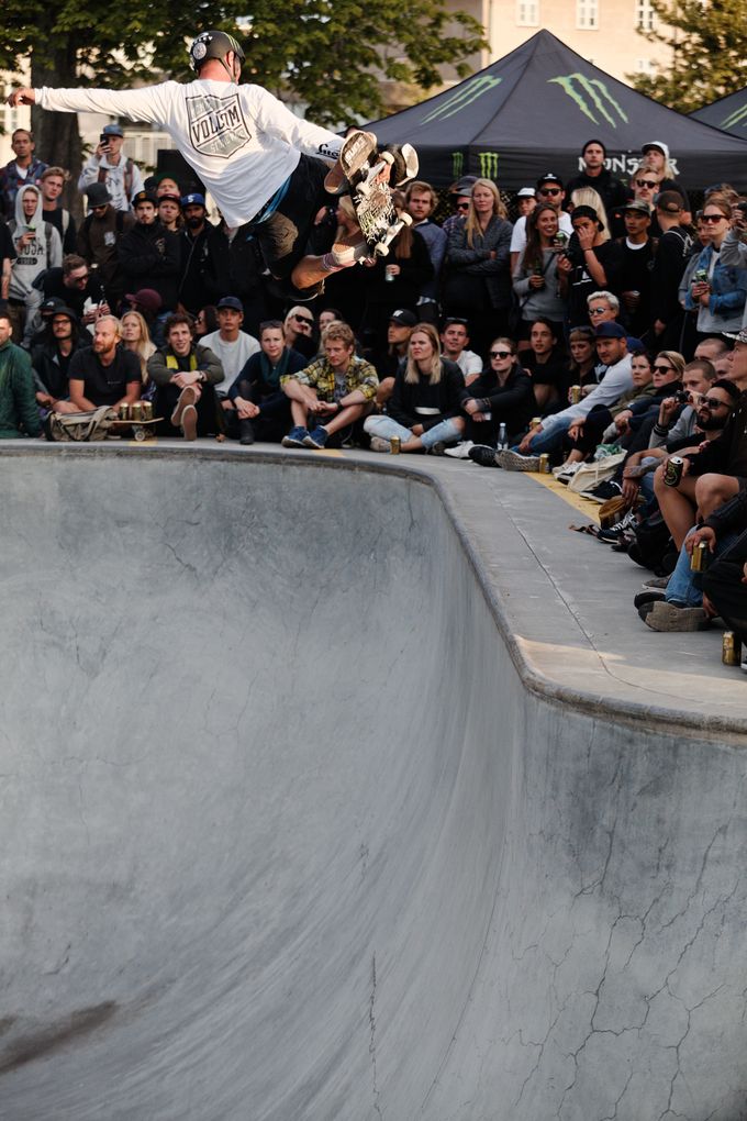 Landings never hold the same fear for me, with Copenhagen offering the added bonus of a scenic view over the islands and waterways of the city as the plane descends. We spend the first evening pushing the streets and cycle lanes in our area, searching for cheap bars and avoiding the caressing hands of particularly forward hookers. The next day brings us to the already legendary Faelladparken skatepark, whose concrete curves have been overtaken by a four wheeled horde. The beers are flowing, a jam on the street course is offering the spectators pure visual madness, and a lone scooter child has a look of intense bemusement; the stare of a lobotomy victim coming out of theatre. Yoshi Tenenbaum is landing tricks with ridiculous ease, as is Alex Mizurov (who eventually takes 1st).