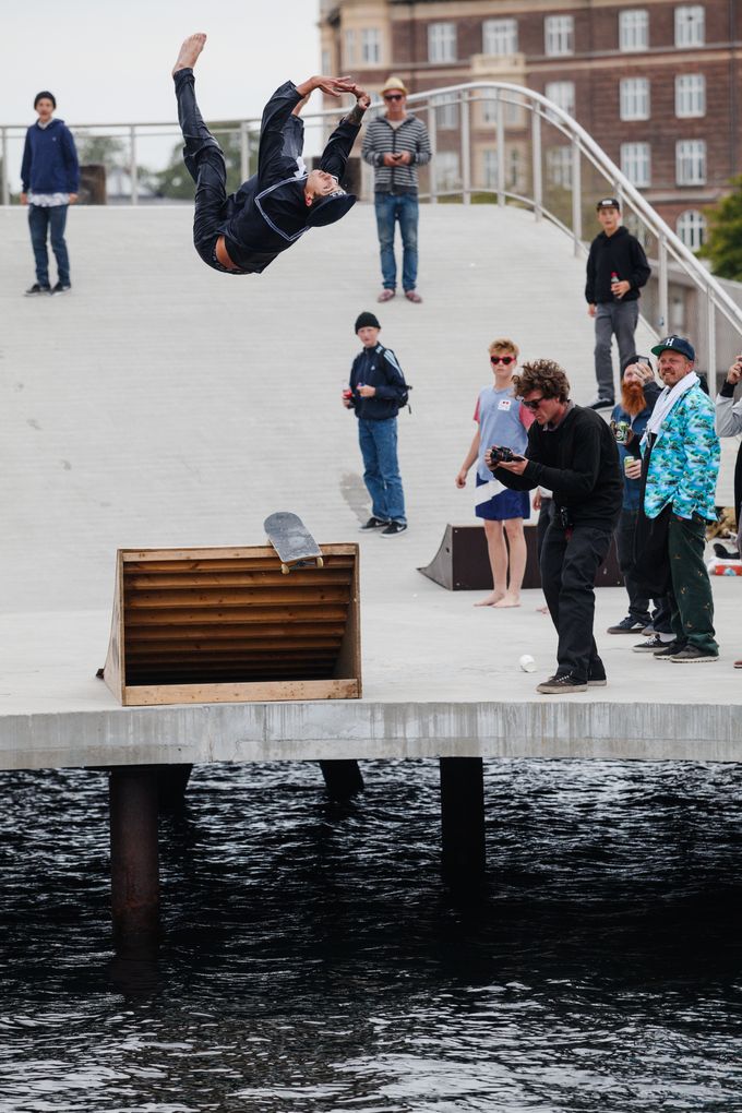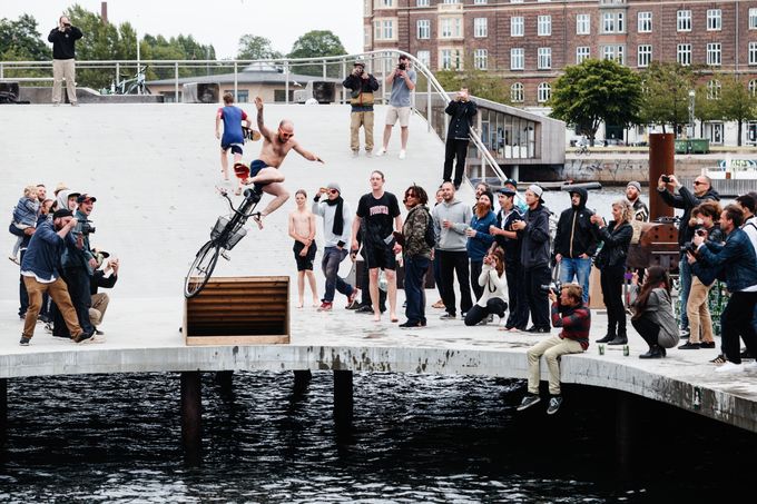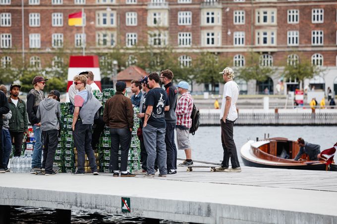 I’m in a little better shape than some, but can’t claim to be completely unscathed. My legs are starting to suffer from a week of skating from one end of the city to the other, the tendonitis in my foot is sending warning signals to my brain and, when I look in the mirror, I am faced with a half-crazed and gaunt stranger. After watching people fly out of the kicker ramp and splash into the estuary for a while, we head to the skatepark across the bridge where within half an hour I have bruised my heel and wrenched my back. After a week of skating Faelladparken and Christiania with a surprisingly low number of slams, this is clearly skateboarding’s cosmic prank at my expense. Rather than moan I decide to roll with it, take some painkillers and head back across the river to round some troops up for a street mission.