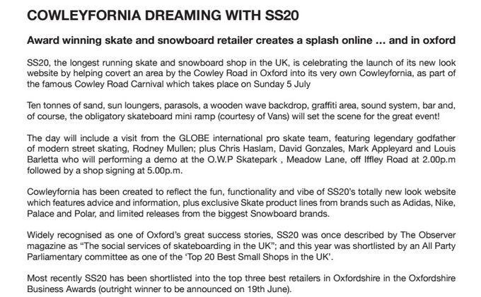 SS20 is getting involved in this years Cowley Road Carnival in Oxford, with a miniramp and a visit from the