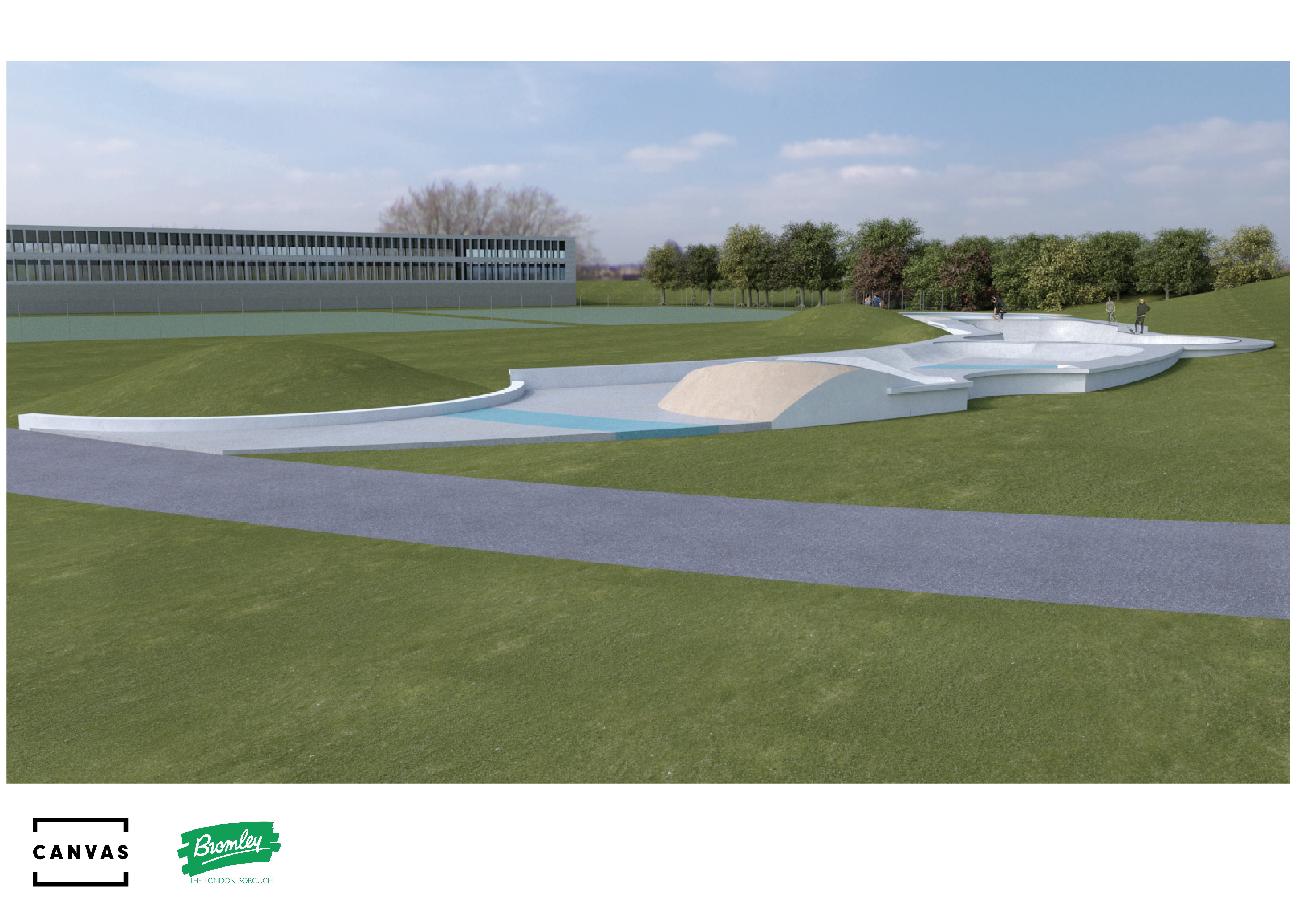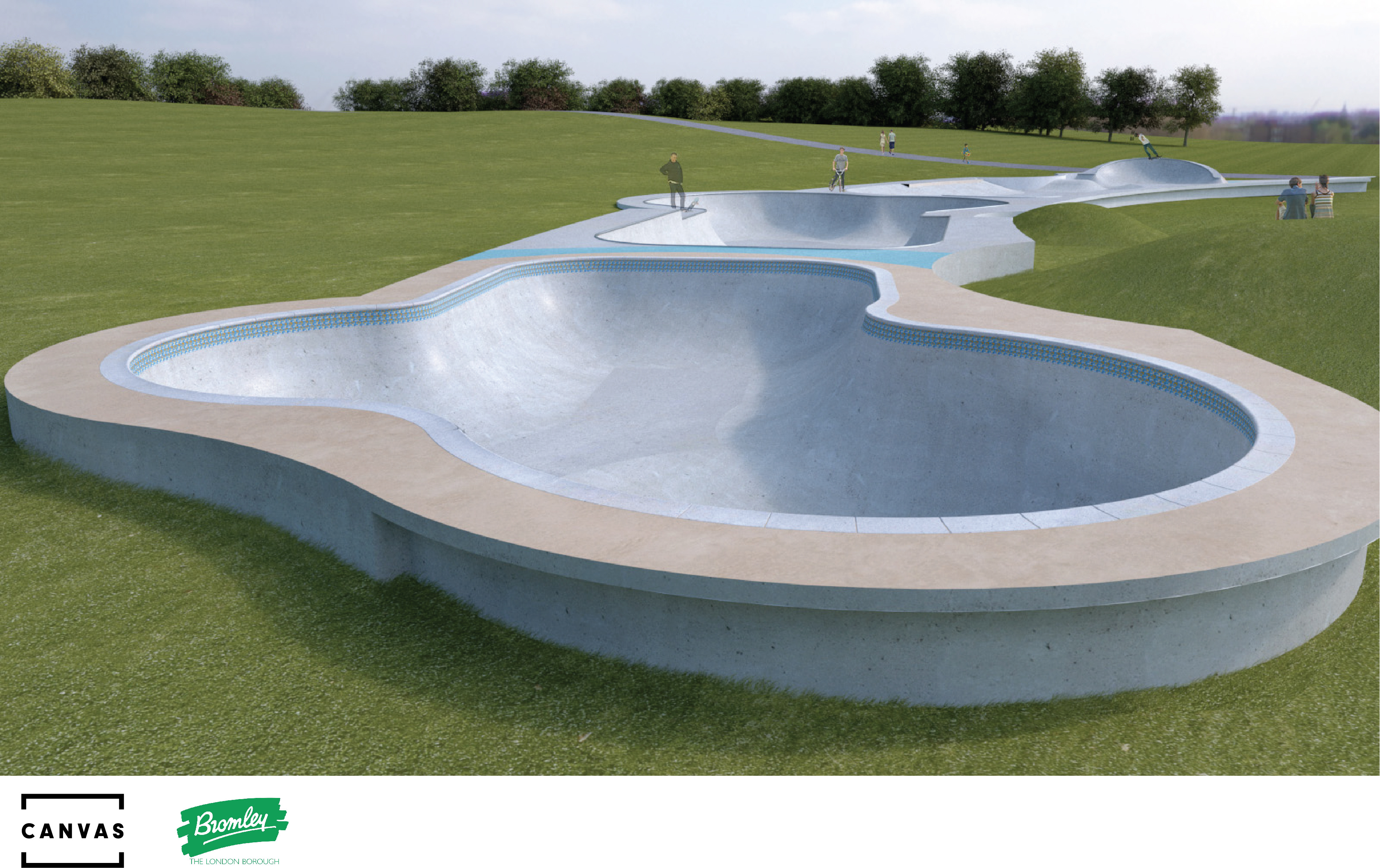 The skatepark, funded by the Mayor of London, consists of an extended 100 metre (330 feet) long and 11metre (35 feet) wide curved concrete band, filled with a wide range of rideable terrains. At one end sits an advanced cloverleaf pool, complete with swimming pool-style stone coping and tiling. In the middle is an L-shaped steelcoping bowl, particularly suited to skilled transition riders, and offering a multitude of hips and curves. And at the other end of the skatepark is a large mellow section, aimed at those of all abilities and riding styles, and for those just seeking to explore different lines and speeds. BMX, quad-skating, rollerblading, scootering and skateboarding have all been considered in this design, and riders of all ages and abilities will be very welcome.