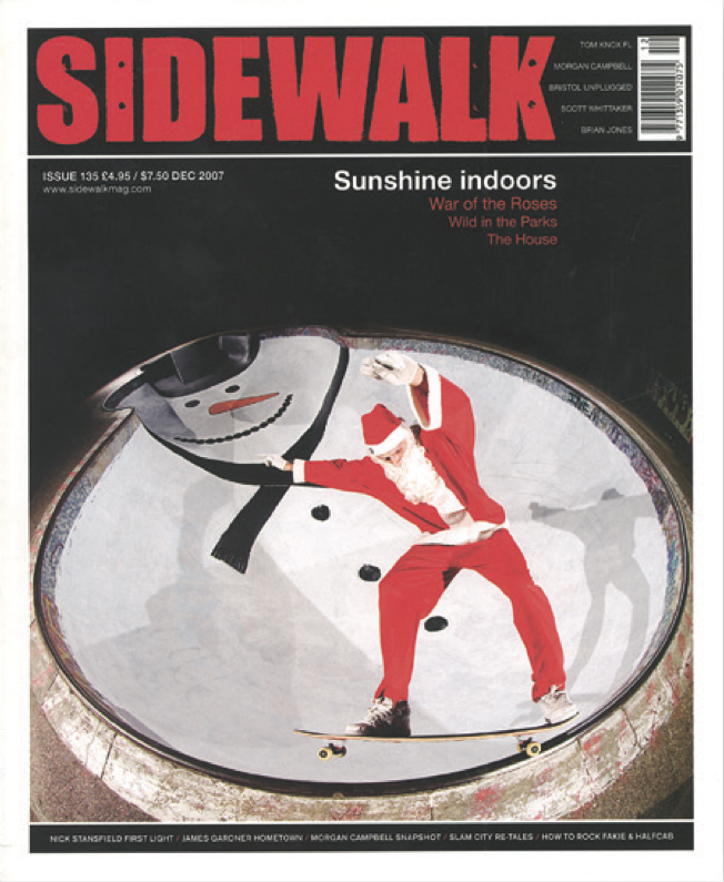 – I remember it was actually Styley who came up with the idea one night whilst we were sat on a bus going through south London. Out of the blue he explained to me that he had noticed that the pool at Harrow was basically snowman-shaped and that we should paint it for a Christmas themed shot. I told him yes there and then, but didn’t hear anything more from him about it after that. It got to October and I finally phoned him up and told him that we were going to do it that week. The next day we got about 15 litres of masonry paint and got to work painting the pool from 11p.m. until about 2a.m. We went back the following night with a Santa Claus suit and for some reason a 42-inch long board. Strangely we made it onto the cover of the Christmas mag. I’m still stoked about it now! Thanks boys.