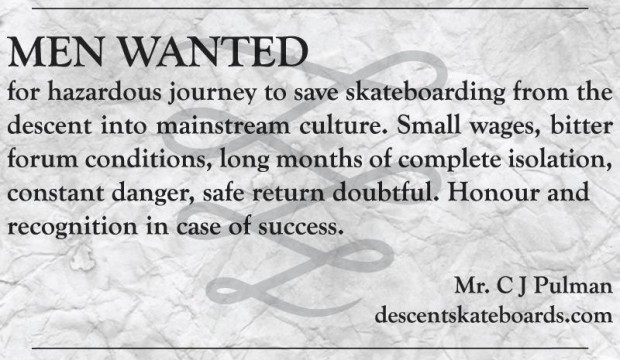 Mr Pulman is embarking on a voyage into the seven-ply marketplace with his new venture, Descent Skateboards. Little is known about the project at the minute, but click the ‘Men Wanted’ ad below to have a snoop around on the Descent website.